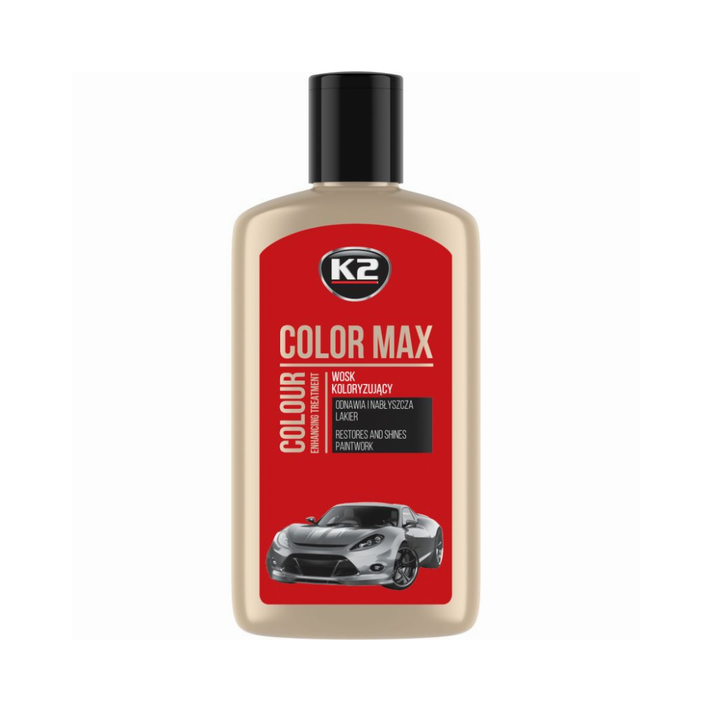 K2 Color Max polirolyje yra specialių dažų pigmentų, kurie lengvai susilieja su orginalia automobilio spalva, ją atnaujina, suteikia blizgesio, panaikina apnašas, dervos dėmes, užpildo smulkius įbrėžimus ir padengia paviršių vašku.