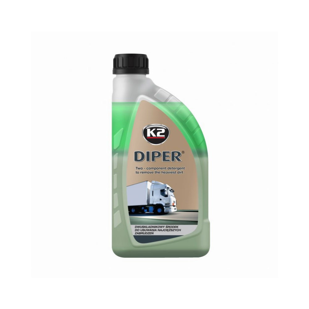 K2 “Diper” Pasižymi puikiomis riebalų šalinimo savybėmis ir labai plačiu pritaikymu. Greitai ir efektyviai pašalina nešvarumus nuo brezento, sunkvežimių kėbulo , furgonų kėbulo, cisternų, traukinių kėbulo, važiuoklės, ratų, aliuminio detalių, įrankių ir pan. Koncentruotas produktas gali būti naudojamas skiedžiant su vandeniu kaip purvą tirpdančios putos, žemo slėgio arba aukšto slėgio purškimui.