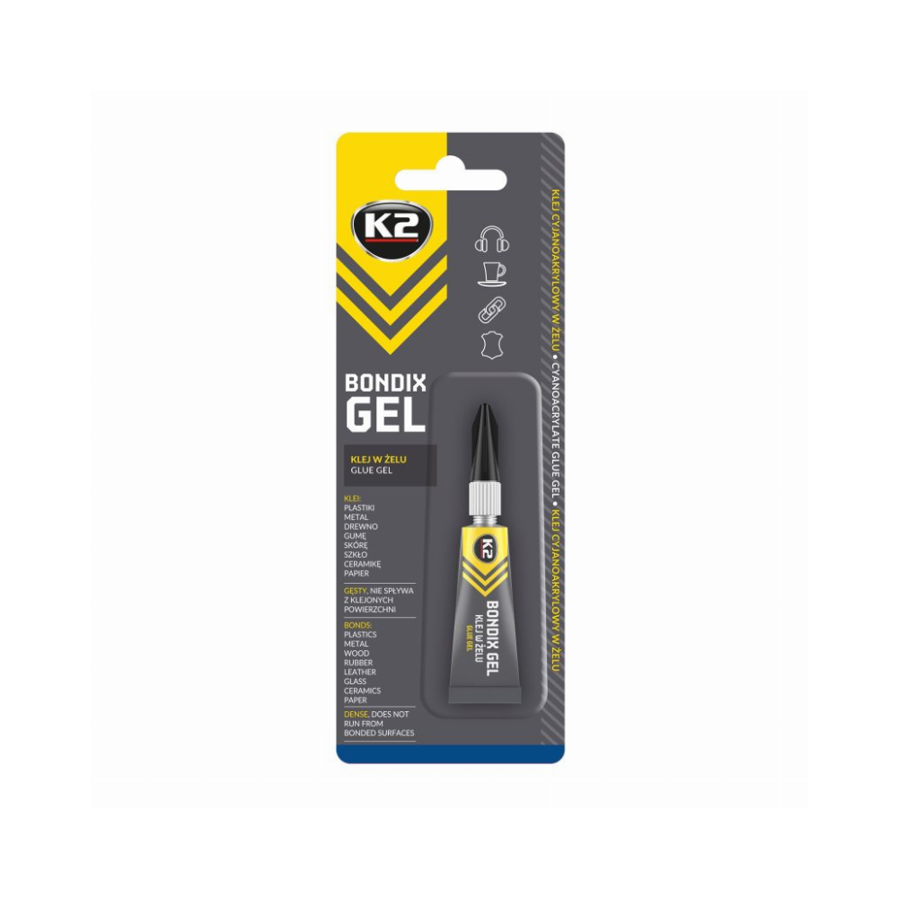K2 „BONDIX GEL“ yra cianoakrilato gelio klijai, pasižymintys dideliu sukibimu ir greitu džiūvimu. Puikiai tinka klijuoti tokių medžiagų derinius kaip metalas, plastikas, mediena, audiniai, popierius, oda, kempinės ir kt. Po džiūvimo pasižymi dideliu stiprumu ir atsparumu vandeniui bei alyvai. K2 „Bondix Gel“ klijai dėl savo stingimo laiko ir plataus pritaikymo spektro yra laikomi daugiafunkciniais klijais, dažnai naudojami pramonėje, reklamos srityje, automobilių servisuose ir namuose.