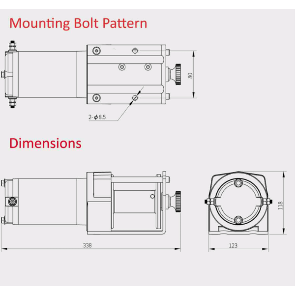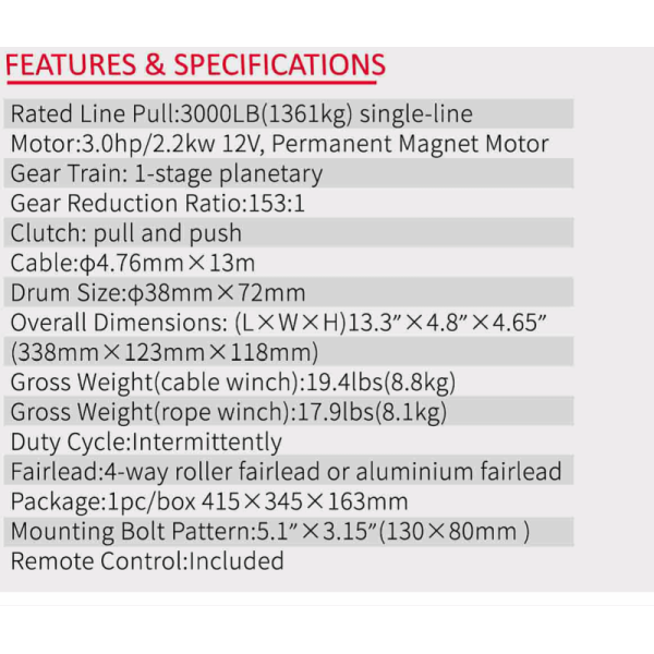 Tempimo galia - 1361kg; Variklis - 3.0hp/2,2kw; Įtampa - 12V; Pavarų dėžė - planetarinė 1 pakopas; reduktorius - 153:1; Plieninio lyno skersmuo - 4,76 mm, lyno ilgis - 13m; Būgno dydis - skersmuo 38mm; ilgis - 72mm; gervės išmatavimai - 338mm x 123mm x 118mm; svoris - 8,8 kg; Valdymo pultas: laidinis ir belaidis (nuotolinis).