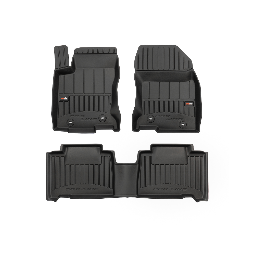 Guminiai ProLine 3D kilimėliai: (aukštos kokybės plastiko, gumos mišinys / TPE, komplektas - 3vnt., juodi, krašto aukštis 7 cm, montavimo būdas - spaustukai).AUTOMOBILIŲ KILIMĖLIAI FROGUM 3D PROLINE LUXURY• Dėl naujoviškos 3D skenavimo technologijos atitinka idealiai; • Kraštai papildomai apsaugoti – aukštis 7 cm, visada švarus automobilis; • Itin patvari medžiaga su unikalia neslystančia struktūra, atspari nešvarumams. • Išskirtinis stabilumas dėl spaustukų – lengvai montuojama spustelėjus; • Pakojo zonos apsauga – komfortas, leidžiantis nuleisti vairuotojo koją;3D ProLine aukštos kokybės guminiai kilimėliai padeda išlaikyti automobilį švarų. Modernus ir funkcionalus dizainas, ir ypač aukštas kraštas garantuoja efektyvų vandens ir purvo surinkimą ir neleidžia jiems išbėgti. Taip automobilio salonas išlieka švarus. Pagaminti iš aukštos kokybės gumos, kurioje nėra toksiškų komponentų. Bekvapis. Kilimėliai idealiai atitinka ir puikiai priglunda prie salono grindų. Guminiai kilimėliai išlaiko savo elastingumą net esant temperatūros pokyčiams. Specialus paviršius neleidžia kilimėliams slysti vairuojant, o tai daro didelę įtaką saugumui ir kelionės patogumui