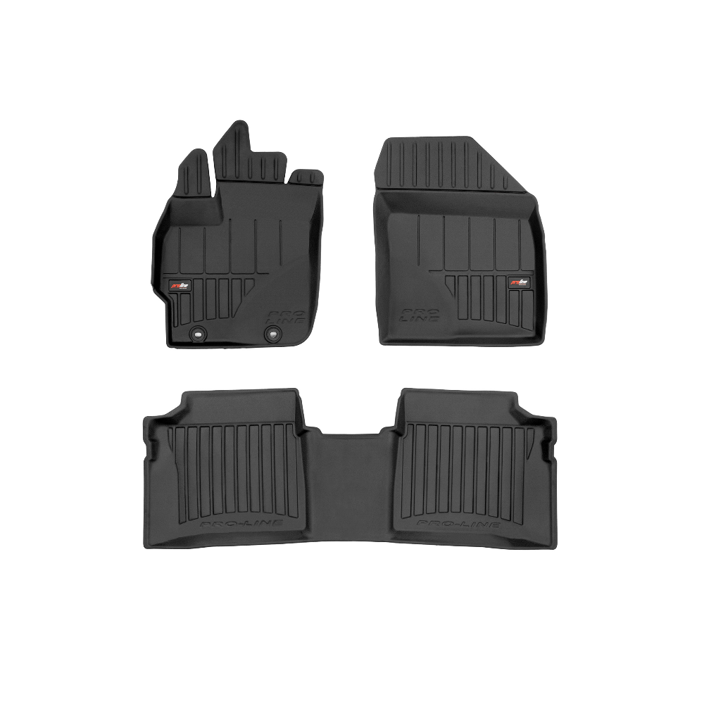 Guminiai ProLine 3D kilimėliai: (aukštos kokybės plastiko, gumos mišinys / TPE, komplektas - 3vnt., juodi, krašto aukštis 7 cm, montavimo būdas - spaustukai).AUTOMOBILIŲ KILIMĖLIAI FROGUM 3D PROLINE LUXURY• Dėl naujoviškos 3D skenavimo technologijos atitinka idealiai; • Kraštai papildomai apsaugoti – aukštis 7 cm, visada švarus automobilis; • Itin patvari medžiaga su unikalia neslystančia struktūra, atspari nešvarumams. • Išskirtinis stabilumas dėl spaustukų – lengvai montuojama spustelėjus; • Pakojo zonos apsauga – komfortas, leidžiantis nuleisti vairuotojo koją;3D ProLine aukštos kokybės guminiai kilimėliai padeda išlaikyti automobilį švarų. Modernus ir funkcionalus dizainas, ir ypač aukštas kraštas garantuoja efektyvų vandens ir purvo surinkimą ir neleidžia jiems išbėgti. Taip automobilio salonas išlieka švarus. Pagaminti iš aukštos kokybės gumos, kurioje nėra toksiškų komponentų. Bekvapis. Kilimėliai idealiai atitinka ir puikiai priglunda prie salono grindų. Guminiai kilimėliai išlaiko savo elastingumą net esant temperatūros pokyčiams. Specialus paviršius neleidžia kilimėliams slysti vairuojant, o tai daro didelę įtaką saugumui ir kelionės patogumui