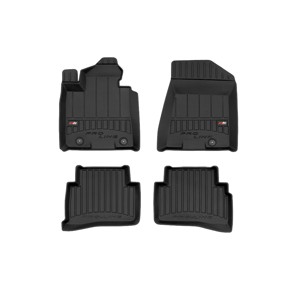 Guminiai ProLine 3D kilimėliai: (aukštos kokybės plastiko, gumos mišinys / TPE, komplektas - 4vnt., juodi, krašto aukštis 7 cm, montavimo būdas - spaustukai).AUTOMOBILIŲ KILIMĖLIAI FROGUM 3D PROLINE LUXURY• Dėl naujoviškos 3D skenavimo technologijos atitinka idealiai; • Kraštai papildomai apsaugoti – aukštis 7 cm, visada švarus automobilis; • Itin patvari medžiaga su unikalia neslystančia struktūra, atspari nešvarumams. • Išskirtinis stabilumas dėl spaustukų – lengvai montuojama spustelėjus; • Pakojo zonos apsauga – komfortas, leidžiantis nuleisti vairuotojo koją;3D ProLine aukštos kokybės guminiai kilimėliai padeda išlaikyti automobilį švarų. Modernus ir funkcionalus dizainas, ir ypač aukštas kraštas garantuoja efektyvų vandens ir purvo surinkimą ir neleidžia jiems išbėgti. Taip automobilio salonas išlieka švarus. Pagaminti iš aukštos kokybės gumos, kurioje nėra toksiškų komponentų. Bekvapis. Kilimėliai idealiai atitinka ir puikiai priglunda prie salono grindų. Guminiai kilimėliai išlaiko savo elastingumą net esant temperatūros pokyčiams. Specialus paviršius neleidžia kilimėliams slysti vairuojant, o tai daro didelę įtaką saugumui ir kelionės patogumui