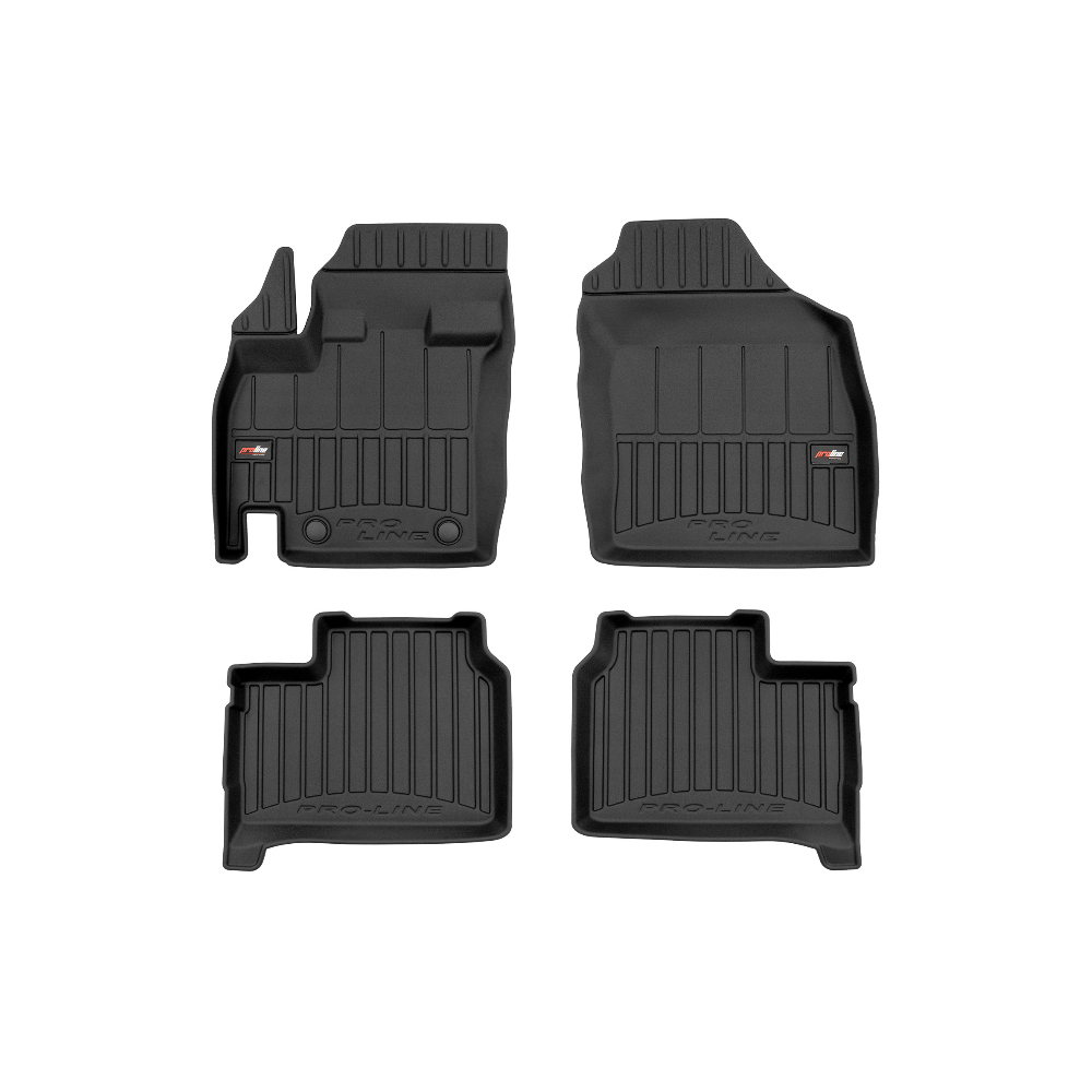 Guminiai ProLine 3D kilimėliai: (aukštos kokybės plastiko, gumos mišinys / TPE, komplektas - 4vnt., juodi, krašto aukštis 7 cm, montavimo būdas - spaustukai).AUTOMOBILIŲ KILIMĖLIAI FROGUM 3D PROLINE LUXURY• Dėl naujoviškos 3D skenavimo technologijos atitinka idealiai; • Kraštai papildomai apsaugoti – aukštis 7 cm, visada švarus automobilis; • Itin patvari medžiaga su unikalia neslystančia struktūra, atspari nešvarumams. • Išskirtinis stabilumas dėl spaustukų – lengvai montuojama spustelėjus; • Pakojo zonos apsauga – komfortas, leidžiantis nuleisti vairuotojo koją;3D ProLine aukštos kokybės guminiai kilimėliai padeda išlaikyti automobilį švarų. Modernus ir funkcionalus dizainas, ir ypač aukštas kraštas garantuoja efektyvų vandens ir purvo surinkimą ir neleidžia jiems išbėgti. Taip automobilio salonas išlieka švarus. Pagaminti iš aukštos kokybės gumos, kurioje nėra toksiškų komponentų. Bekvapis. Kilimėliai idealiai atitinka ir puikiai priglunda prie salono grindų. Guminiai kilimėliai išlaiko savo elastingumą net esant temperatūros pokyčiams. Specialus paviršius neleidžia kilimėliams slysti vairuojant, o tai daro didelę įtaką saugumui ir kelionės patogumui