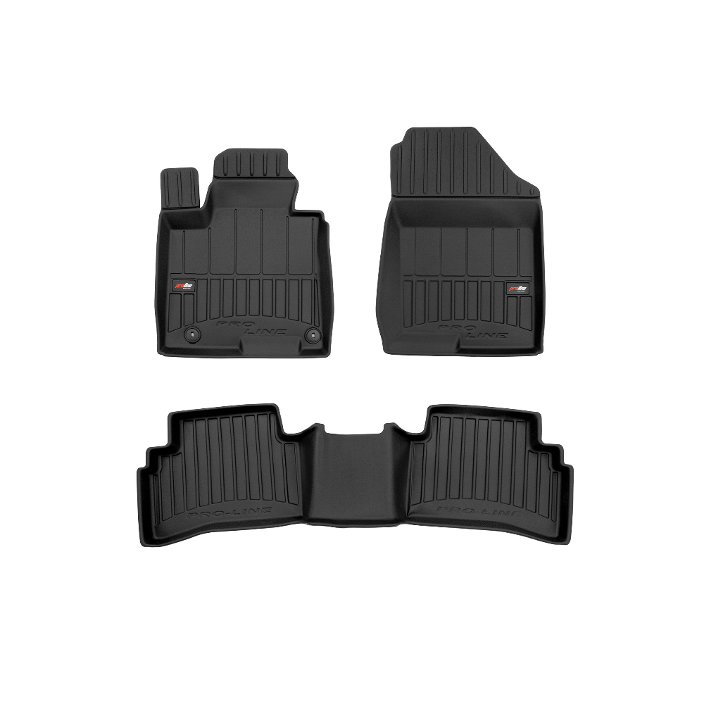 Guminiai ProLine 3D kilimėliai: (aukštos kokybės plastiko, gumos mišinys / TPE, komplektas - 3vnt., juodi, krašto aukštis 7 cm, montavimo būdas - spaustukai).AUTOMOBILIŲ KILIMĖLIAI FROGUM 3D PROLINE LUXURY• Dėl naujoviškos 3D skenavimo technologijos atitinka idealiai; • Kraštai papildomai apsaugoti – aukštis 7 cm, visada švarus automobilis; • Itin patvari medžiaga su unikalia neslystančia struktūra, atspari nešvarumams. • Išskirtinis stabilumas dėl spaustukų – lengvai montuojama spustelėjus; • Pakojo zonos apsauga – komfortas, leidžiantis nuleisti vairuotojo koją;3D ProLine aukštos kokybės guminiai kilimėliai padeda išlaikyti automobilį švarų. Modernus ir funkcionalus dizainas, ir ypač aukštas kraštas garantuoja efektyvų vandens ir purvo surinkimą ir neleidžia jiems išbėgti. Taip automobilio salonas išlieka švarus. Pagaminti iš aukštos kokybės gumos, kurioje nėra toksiškų komponentų. Bekvapis. Kilimėliai idealiai atitinka ir puikiai priglunda prie salono grindų. Guminiai kilimėliai išlaiko savo elastingumą net esant temperatūros pokyčiams. Specialus paviršius neleidžia kilimėliams slysti vairuojant, o tai daro didelę įtaką saugumui ir kelionės patogumui