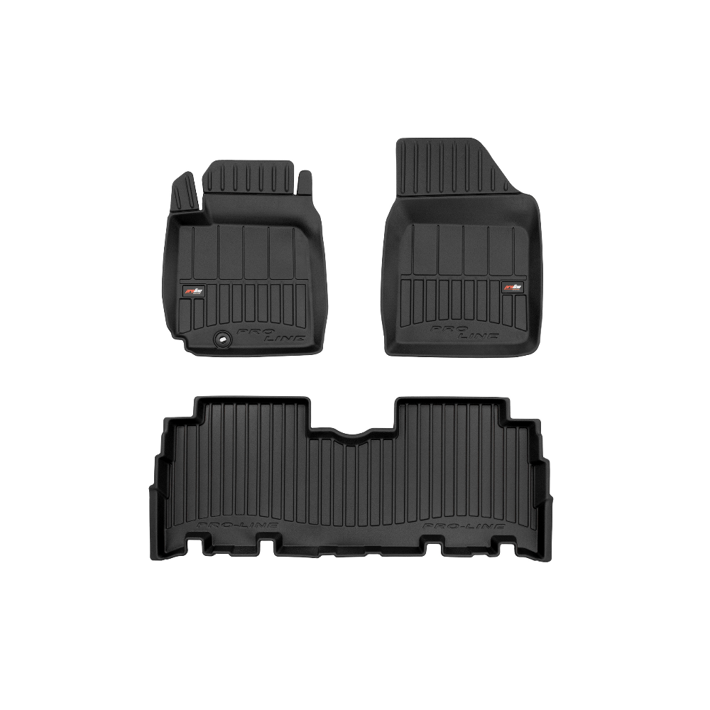 Guminiai ProLine 3D kilimėliai: (aukštos kokybės plastiko, gumos mišinys / TPE, komplektas - 3vnt., juodi, krašto aukštis 7 cm, montavimo būdas - spaustukai).AUTOMOBILIŲ KILIMĖLIAI FROGUM 3D PROLINE LUXURY• Dėl naujoviškos 3D skenavimo technologijos atitinka idealiai; • Kraštai papildomai apsaugoti – aukštis 7 cm, visada švarus automobilis; • Itin patvari medžiaga su unikalia neslystančia struktūra, atspari nešvarumams. • Išskirtinis stabilumas dėl spaustukų – lengvai montuojama spustelėjus; • Pakojo zonos apsauga – komfortas, leidžiantis nuleisti vairuotojo koją;3D ProLine aukštos kokybės guminiai kilimėliai padeda išlaikyti automobilį švarų. Modernus ir funkcionalus dizainas, ir ypač aukštas kraštas garantuoja efektyvų vandens ir purvo surinkimą ir neleidžia jiems išbėgti. Taip automobilio salonas išlieka švarus. Pagaminti iš aukštos kokybės gumos, kurioje nėra toksiškų komponentų. Bekvapis. Kilimėliai idealiai atitinka ir puikiai priglunda prie salono grindų. Guminiai kilimėliai išlaiko savo elastingumą net esant temperatūros pokyčiams. Specialus paviršius neleidžia kilimėliams slysti vairuojant, o tai daro didelę įtaką saugumui ir kelionės patogumui