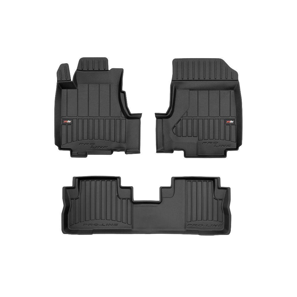 Guminiai ProLine 3D kilimėliai: (aukštos kokybės plastiko, gumos mišinys / TPE, komplektas - 3vnt., juodi, krašto aukštis 7 cm, montavimo būdas - spaustukai).AUTOMOBILIŲ KILIMĖLIAI FROGUM 3D PROLINE LUXURY• Dėl naujoviškos 3D skenavimo technologijos atitinka idealiai; • Kraštai papildomai apsaugoti – aukštis 7 cm, visada švarus automobilis; • Itin patvari medžiaga su unikalia neslystančia struktūra, atspari nešvarumams. • Išskirtinis stabilumas dėl spaustukų – lengvai montuojama spustelėjus; • Pakojo zonos apsauga – komfortas, leidžiantis nuleisti vairuotojo koją;3D ProLine aukštos kokybės guminiai kilimėliai padeda išlaikyti automobilį švarų. Modernus ir funkcionalus dizainas, ir ypač aukštas kraštas garantuoja efektyvų vandens ir purvo surinkimą ir neleidžia jiems išbėgti. Taip automobilio salonas išlieka švarus. Pagaminti iš aukštos kokybės gumos, kurioje nėra toksiškų komponentų. Bekvapis. Kilimėliai idealiai atitinka ir puikiai priglunda prie salono grindų. Guminiai kilimėliai išlaiko savo elastingumą net esant temperatūros pokyčiams. Specialus paviršius neleidžia kilimėliams slysti vairuojant, o tai daro didelę įtaką saugumui ir kelionės patogumui
