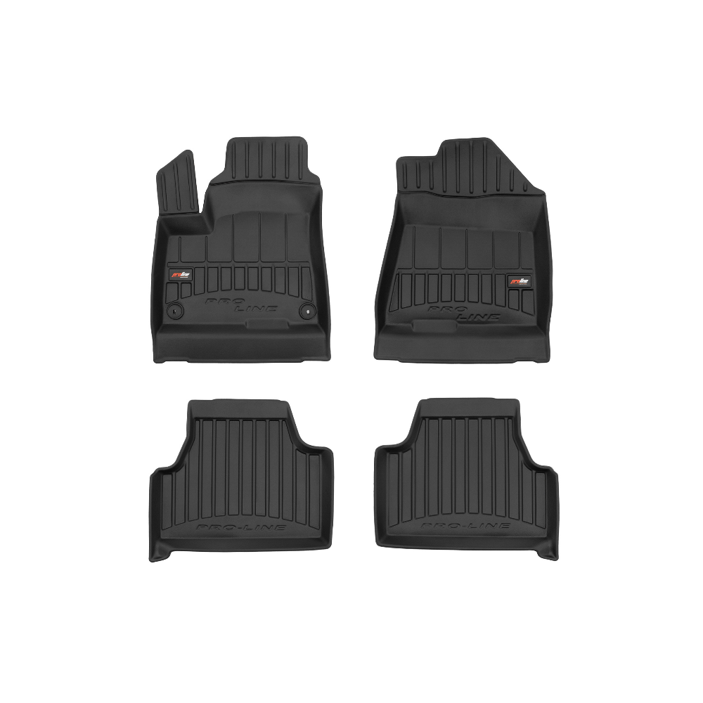 Guminiai ProLine 3D kilimėliai: (aukštos kokybės plastiko, gumos mišinys / TPE, komplektas - 4vnt., juodi, krašto aukštis 7 cm, montavimo būdas - spaustukai).AUTOMOBILIŲ KILIMĖLIAI FROGUM 3D PROLINE LUXURY• Dėl naujoviškos 3D skenavimo technologijos atitinka idealiai; • Kraštai papildomai apsaugoti – aukštis 7 cm, visada švarus automobilis; • Itin patvari medžiaga su unikalia neslystančia struktūra, atspari nešvarumams. • Išskirtinis stabilumas dėl spaustukų – lengvai montuojama spustelėjus; • Pakojo zonos apsauga – komfortas, leidžiantis nuleisti vairuotojo koją;3D ProLine aukštos kokybės guminiai kilimėliai padeda išlaikyti automobilį švarų. Modernus ir funkcionalus dizainas, ir ypač aukštas kraštas garantuoja efektyvų vandens ir purvo surinkimą ir neleidžia jiems išbėgti. Taip automobilio salonas išlieka švarus. Pagaminti iš aukštos kokybės gumos, kurioje nėra toksiškų komponentų. Bekvapis. Kilimėliai idealiai atitinka ir puikiai priglunda prie salono grindų. Guminiai kilimėliai išlaiko savo elastingumą net esant temperatūros pokyčiams. Specialus paviršius neleidžia kilimėliams slysti vairuojant, o tai daro didelę įtaką saugumui ir kelionės patogumui