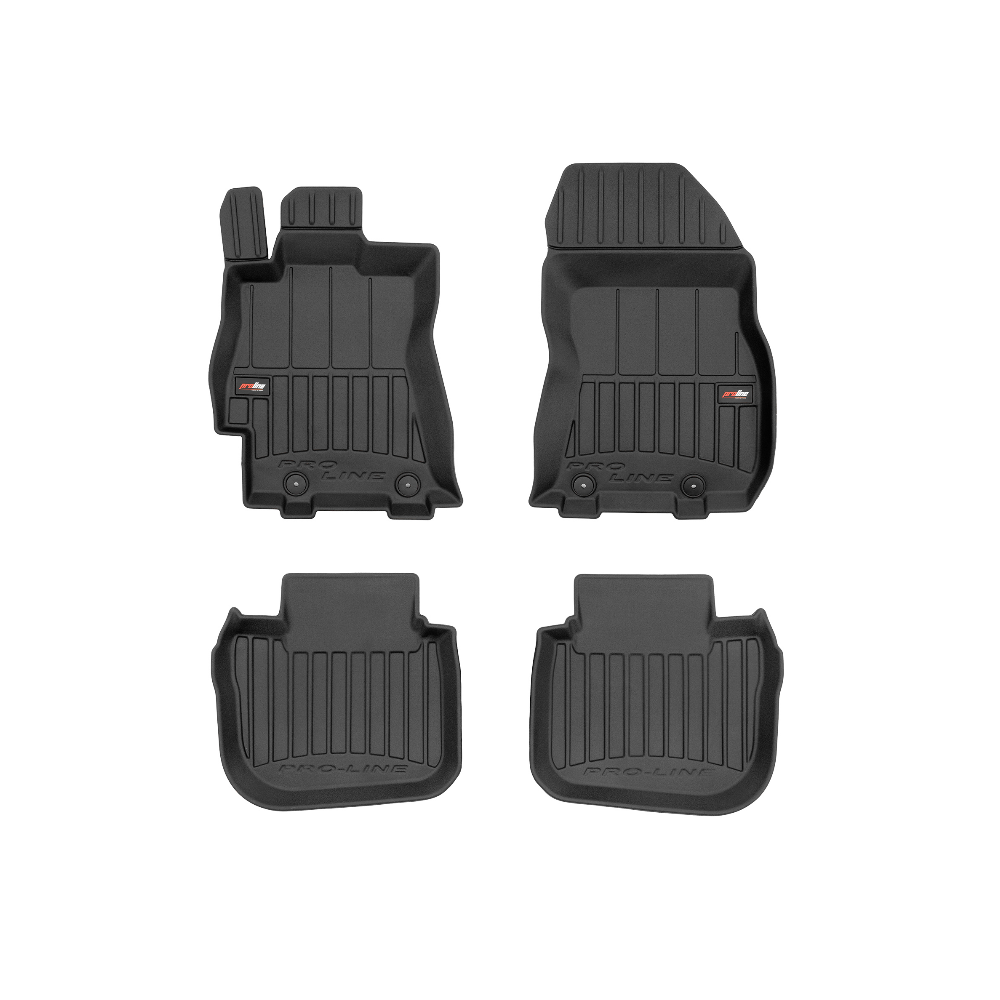 Guminiai ProLine 3D kilimėliai: (aukštos kokybės plastiko, gumos mišinys / TPE, komplektas - 4vnt., juodi, krašto aukštis 7 cm, montavimo būdas - spaustukai).AUTOMOBILIŲ KILIMĖLIAI FROGUM 3D PROLINE LUXURY• Dėl naujoviškos 3D skenavimo technologijos atitinka idealiai; • Kraštai papildomai apsaugoti – aukštis 7 cm, visada švarus automobilis; • Itin patvari medžiaga su unikalia neslystančia struktūra, atspari nešvarumams. • Išskirtinis stabilumas dėl spaustukų – lengvai montuojama spustelėjus; • Pakojo zonos apsauga – komfortas, leidžiantis nuleisti vairuotojo koją;3D ProLine aukštos kokybės guminiai kilimėliai padeda išlaikyti automobilį švarų. Modernus ir funkcionalus dizainas, ir ypač aukštas kraštas garantuoja efektyvų vandens ir purvo surinkimą ir neleidžia jiems išbėgti. Taip automobilio salonas išlieka švarus. Pagaminti iš aukštos kokybės gumos, kurioje nėra toksiškų komponentų. Bekvapis. Kilimėliai idealiai atitinka ir puikiai priglunda prie salono grindų. Guminiai kilimėliai išlaiko savo elastingumą net esant temperatūros pokyčiams. Specialus paviršius neleidžia kilimėliams slysti vairuojant, o tai daro didelę įtaką saugumui ir kelionės patogumui