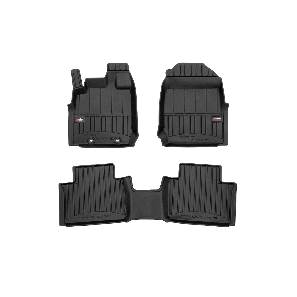 Guminiai ProLine 3D kilimėliai: (aukštos kokybės plastiko, gumos mišinys / TPE, komplektas - 3vnt., juodi, krašto aukštis 7 cm, montavimo būdas - spaustukai).AUTOMOBILIŲ KILIMĖLIAI FROGUM 3D PROLINE LUXURY• Dėl naujoviškos 3D skenavimo technologijos atitinka idealiai; • Kraštai papildomai apsaugoti – aukštis 7 cm, visada švarus automobilis; • Itin patvari medžiaga su unikalia neslystančia struktūra, atspari nešvarumams. • Išskirtinis stabilumas dėl spaustukų – lengvai montuojama spustelėjus; • Pakojo zonos apsauga – komfortas, leidžiantis nuleisti vairuotojo koją;3D ProLine aukštos kokybės guminiai kilimėliai padeda išlaikyti automobilį švarų. Modernus ir funkcionalus dizainas, ir ypač aukštas kraštas garantuoja efektyvų vandens ir purvo surinkimą ir neleidžia jiems išbėgti. Taip automobilio salonas išlieka švarus. Pagaminti iš aukštos kokybės gumos, kurioje nėra toksiškų komponentų. Bekvapis. Kilimėliai idealiai atitinka ir puikiai priglunda prie salono grindų. Guminiai kilimėliai išlaiko savo elastingumą net esant temperatūros pokyčiams. Specialus paviršius neleidžia kilimėliams slysti vairuojant, o tai daro didelę įtaką saugumui ir kelionės patogumui