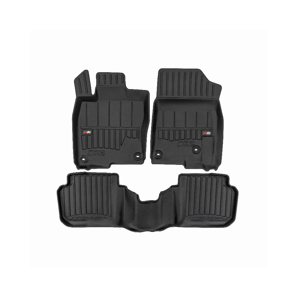 Guminiai ProLine 3D kilimėliai: (aukštos kokybės plastiko, gumos mišinys / TPE, komplektas - 3vnt., juodi, krašto aukštis 7 cm, montavimo būdas - spaustukai).AUTOMOBILIŲ KILIMĖLIAI FROGUM 3D PROLINE LUXURY• Dėl naujoviškos 3D skenavimo technologijos atitinka idealiai; • Kraštai papildomai apsaugoti – aukštis 7 cm, visada švarus automobilis; • Itin patvari medžiaga su unikalia neslystančia struktūra, atspari nešvarumams. • Išskirtinis stabilumas dėl spaustukų – lengvai montuojama spustelėjus; • Pakojo zonos apsauga – komfortas, leidžiantis nuleisti vairuotojo koją;3D ProLine aukštos kokybės guminiai kilimėliai padeda išlaikyti automobilį švarų. Modernus ir funkcionalus dizainas, ir ypač aukštas kraštas garantuoja efektyvų vandens ir purvo surinkimą ir neleidžia jiems išbėgti. Taip automobilio salonas išlieka švarus. Pagaminti iš aukštos kokybės gumos, kurioje nėra toksiškų komponentų. Bekvapis. Kilimėliai idealiai atitinka ir puikiai priglunda prie salono grindų. Guminiai kilimėliai išlaiko savo elastingumą net esant temperatūros pokyčiams. Specialus paviršius neleidžia kilimėliams slysti vairuojant, o tai daro didelę įtaką saugumui ir kelionės patogumui