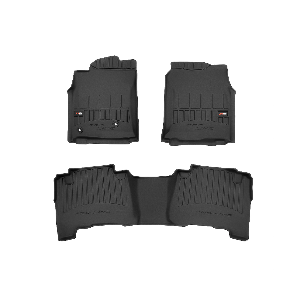 Guminiai ProLine 3D kilimėliai: (aukštos kokybės plastiko, gumos mišinys / TPE, komplektas - 3vnt., juodi, krašto aukštis 7 cm, montavimo būdas - spaustukai).AUTOMOBILIŲ KILIMĖLIAI FROGUM 3D PROLINE LUXURY• Dėl naujoviškos 3D skenavimo technologijos atitinka idealiai; • Kraštai papildomai apsaugoti – aukštis 7 cm, visada švarus automobilis; • Itin patvari medžiaga su unikalia neslystančia struktūra, atspari nešvarumams. • Išskirtinis stabilumas dėl spaustukų – lengvai montuojama spustelėjus; • Pakojo zonos apsauga – komfortas, leidžiantis nuleisti vairuotojo koją;3D ProLine aukštos kokybės guminiai kilimėliai padeda išlaikyti automobilį švarų. Modernus ir funkcionalus dizainas, ir ypač aukštas kraštas garantuoja efektyvų vandens ir purvo surinkimą ir neleidžia jiems išbėgti. Taip automobilio salonas išlieka švarus. Pagaminti iš aukštos kokybės gumos, kurioje nėra toksiškų komponentų. Bekvapis. Kilimėliai idealiai atitinka ir puikiai priglunda prie salono grindų. Guminiai kilimėliai išlaiko savo elastingumą net esant temperatūros pokyčiams. Specialus paviršius neleidžia kilimėliams slysti vairuojant, o tai daro didelę įtaką saugumui ir kelionės patogumui