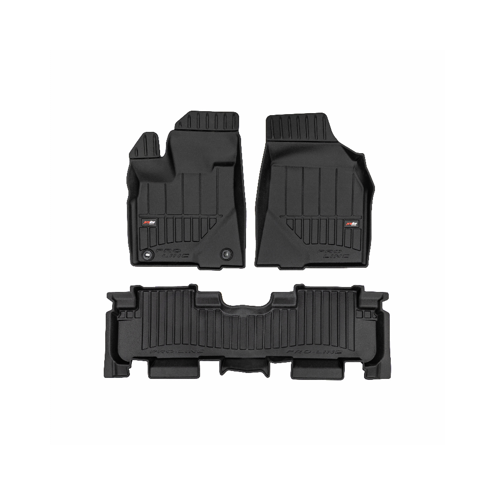 Guminiai ProLine 3D kilimėliai: (aukštos kokybės plastiko, gumos mišinys / TPE, komplektas - 3vnt., juodi, krašto aukštis 7 cm, montavimo būdas - spaustukai).AUTOMOBILIŲ KILIMĖLIAI FROGUM 3D PROLINE LUXURY• Dėl naujoviškos 3D skenavimo technologijos atitinka idealiai; • Kraštai papildomai apsaugoti – aukštis 7 cm, visada švarus automobilis; • Itin patvari medžiaga su unikalia neslystančia struktūra, atspari nešvarumams. • Išskirtinis stabilumas dėl spaustukų – lengvai montuojama spustelėjus; • Pakojo zonos apsauga – komfortas, leidžiantis nuleisti vairuotojo koją;3D ProLine aukštos kokybės guminiai kilimėliai padeda išlaikyti automobilį švarų. Modernus ir funkcionalus dizainas, ir ypač aukštas kraštas garantuoja efektyvų vandens ir purvo surinkimą ir neleidžia jiems išbėgti. Taip automobilio salonas išlieka švarus. Pagaminti iš aukštos kokybės gumos, kurioje nėra toksiškų komponentų. Bekvapis. Kilimėliai idealiai atitinka ir puikiai priglunda prie salono grindų. Guminiai kilimėliai išlaiko savo elastingumą net esant temperatūros pokyčiams. Specialus paviršius neleidžia kilimėliams slysti vairuojant, o tai daro didelę įtaką saugumui ir kelionės patogumui