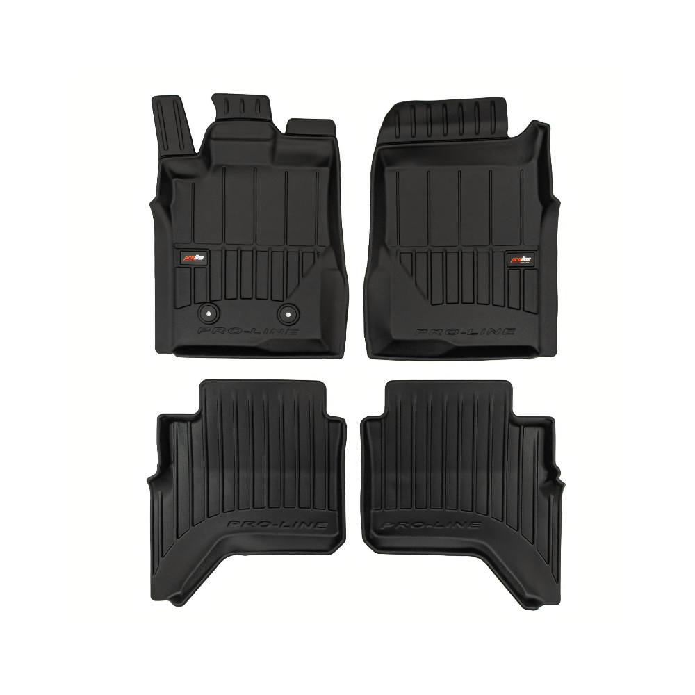 Guminiai ProLine 3D kilimėliai: (aukštos kokybės plastiko, gumos mišinys / TPE, komplektas - 4vnt., juodi, krašto aukštis 7 cm, montavimo būdas - spaustukai).AUTOMOBILIŲ KILIMĖLIAI FROGUM 3D PROLINE LUXURY• Dėl naujoviškos 3D skenavimo technologijos atitinka idealiai; • Kraštai papildomai apsaugoti – aukštis 7 cm, visada švarus automobilis; • Itin patvari medžiaga su unikalia neslystančia struktūra, atspari nešvarumams. • Išskirtinis stabilumas dėl spaustukų – lengvai montuojama spustelėjus; • Pakojo zonos apsauga – komfortas, leidžiantis nuleisti vairuotojo koją;3D ProLine aukštos kokybės guminiai kilimėliai padeda išlaikyti automobilį švarų. Modernus ir funkcionalus dizainas, ir ypač aukštas kraštas garantuoja efektyvų vandens ir purvo surinkimą ir neleidžia jiems išbėgti. Taip automobilio salonas išlieka švarus. Pagaminti iš aukštos kokybės gumos, kurioje nėra toksiškų komponentų. Bekvapis. Kilimėliai idealiai atitinka ir puikiai priglunda prie salono grindų. Guminiai kilimėliai išlaiko savo elastingumą net esant temperatūros pokyčiams. Specialus paviršius neleidžia kilimėliams slysti vairuojant, o tai daro didelę įtaką saugumui ir kelionės patogumui