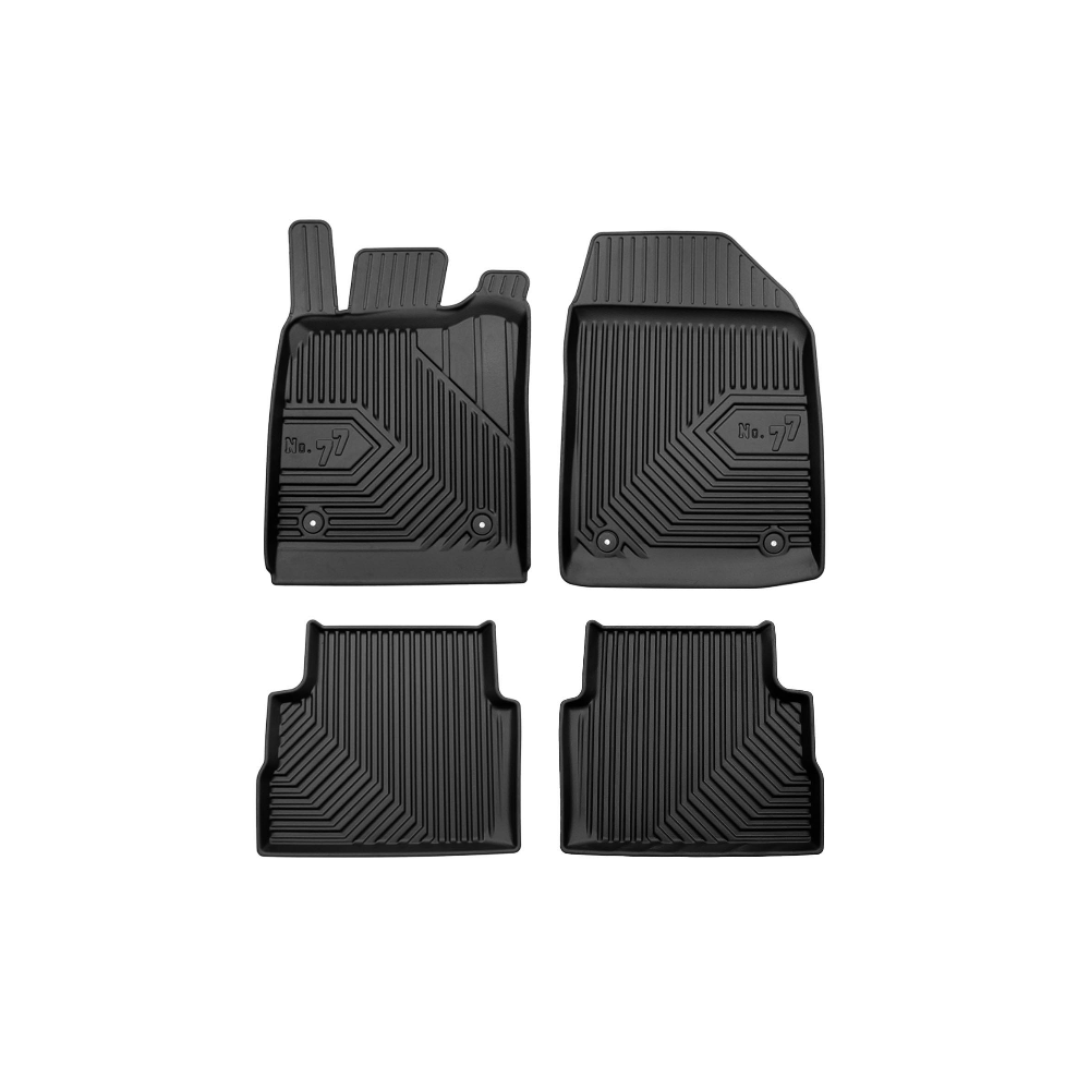 Guminiai Premium 77 kilimėliai: (aukštos kokybės plastiko, gumos mišinys / TPE, komplektas - 4vnt., juodi, krašto aukštis 4 cm, montavimo būdas - spaustukai).AUTOMOBILIŲ KILIMĖLIAI FROGUM 77 PREMIUM• Dėl naujoviškos 3D skenavimo technologijos atitinka idealiai; • Krašto aukštis - 4 cm suteikia didesnę apsaugą nuo nešvarumų • Modernus ir funkcionalus dizainas, išlaikantis nešvarumus kilimėlio viduje • Neslystantys spacialūs spaustukai, lengva montuoti; • Speciali apsauga, leidžianti nuleisti vairuotojo koją;Aukšto lygio apsauga jūsų automobiliui, kilimėliai idealiai atitinka ir puikiai priglunda prie salono grindų. Modernus ir funkcionalus dizainas, bei aukštas kraštas garantuoja efektyvų vandens ir purvo surinkimą ir neleidžia jam nutekėti. Taip automobilio salonas išlieka švarus. Pagaminti iš aukštos kokybės gumos, kurioje nėra toksiškų komponentų. Bekvapis. Kilimėliai turi spaustukus, todėl jį lengva pritvirtinti prie grindų. Guminiai kilimėliai išlaiko savo elastingumą net esant temperatūros pokyčiams. Specialus paviršius neleidžia kilimėliams slysti vairuojant, todėl labai paveikia saugumą ir kelionės komfortą.