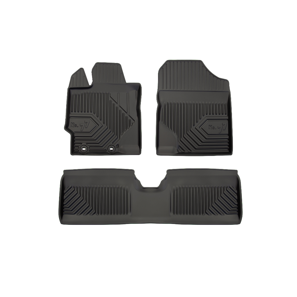 Guminiai Premium 77 kilimėliai: (aukštos kokybės plastiko, gumos mišinys / TPE, komplektas - 3vnt., juodi, krašto aukštis 4 cm, montavimo būdas - spaustukai).AUTOMOBILIŲ KILIMĖLIAI FROGUM 77 PREMIUM• Dėl naujoviškos 3D skenavimo technologijos atitinka idealiai; • Krašto aukštis - 4 cm suteikia didesnę apsaugą nuo nešvarumų • Modernus ir funkcionalus dizainas, išlaikantis nešvarumus kilimėlio viduje • Neslystantys spacialūs spaustukai, lengva montuoti; • Speciali apsauga, leidžianti nuleisti vairuotojo koją;Aukšto lygio apsauga jūsų automobiliui, kilimėliai idealiai atitinka ir puikiai priglunda prie salono grindų. Modernus ir funkcionalus dizainas, bei aukštas kraštas garantuoja efektyvų vandens ir purvo surinkimą ir neleidžia jam nutekėti. Taip automobilio salonas išlieka švarus. Pagaminti iš aukštos kokybės gumos, kurioje nėra toksiškų komponentų. Bekvapis. Kilimėliai turi spaustukus, todėl jį lengva pritvirtinti prie grindų. Guminiai kilimėliai išlaiko savo elastingumą net esant temperatūros pokyčiams. Specialus paviršius neleidžia kilimėliams slysti vairuojant, todėl labai paveikia saugumą ir kelionės komfortą.