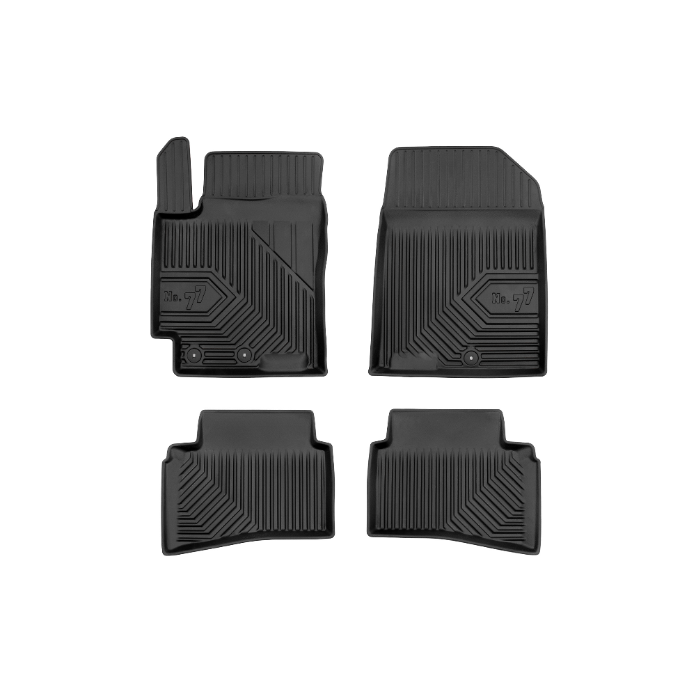Guminiai Premium 77 kilimėliai: (aukštos kokybės plastiko, gumos mišinys / TPE, komplektas - 4vnt., juodi, krašto aukštis 4 cm, montavimo būdas - spaustukai).AUTOMOBILIŲ KILIMĖLIAI FROGUM 77 PREMIUM• Dėl naujoviškos 3D skenavimo technologijos atitinka idealiai; • Krašto aukštis - 4 cm suteikia didesnę apsaugą nuo nešvarumų • Modernus ir funkcionalus dizainas, išlaikantis nešvarumus kilimėlio viduje • Neslystantys spacialūs spaustukai, lengva montuoti; • Speciali apsauga, leidžianti nuleisti vairuotojo koją;Aukšto lygio apsauga jūsų automobiliui, kilimėliai idealiai atitinka ir puikiai priglunda prie salono grindų. Modernus ir funkcionalus dizainas, bei aukštas kraštas garantuoja efektyvų vandens ir purvo surinkimą ir neleidžia jam nutekėti. Taip automobilio salonas išlieka švarus. Pagaminti iš aukštos kokybės gumos, kurioje nėra toksiškų komponentų. Bekvapis. Kilimėliai turi spaustukus, todėl jį lengva pritvirtinti prie grindų. Guminiai kilimėliai išlaiko savo elastingumą net esant temperatūros pokyčiams. Specialus paviršius neleidžia kilimėliams slysti vairuojant, todėl labai paveikia saugumą ir kelionės komfortą.