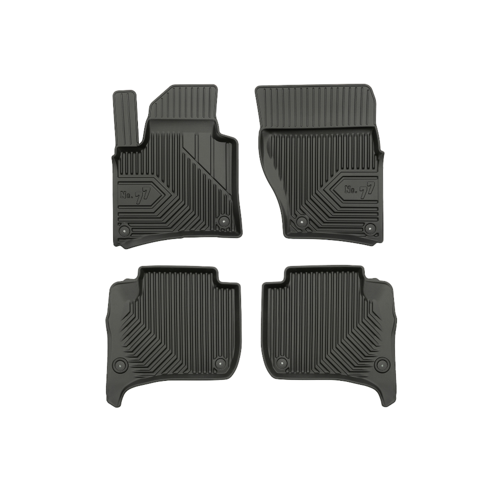 Guminiai Premium 77 kilimėliai: (aukštos kokybės plastiko, gumos mišinys / TPE, komplektas - 4vnt., juodi, krašto aukštis 4 cm, montavimo būdas - spaustukai).AUTOMOBILIŲ KILIMĖLIAI FROGUM 77 PREMIUM• Dėl naujoviškos 3D skenavimo technologijos atitinka idealiai; • Krašto aukštis - 4 cm suteikia didesnę apsaugą nuo nešvarumų • Modernus ir funkcionalus dizainas, išlaikantis nešvarumus kilimėlio viduje • Neslystantys spacialūs spaustukai, lengva montuoti; • Speciali apsauga, leidžianti nuleisti vairuotojo koją;Aukšto lygio apsauga jūsų automobiliui, kilimėliai idealiai atitinka ir puikiai priglunda prie salono grindų. Modernus ir funkcionalus dizainas, bei aukštas kraštas garantuoja efektyvų vandens ir purvo surinkimą ir neleidžia jam nutekėti. Taip automobilio salonas išlieka švarus. Pagaminti iš aukštos kokybės gumos, kurioje nėra toksiškų komponentų. Bekvapis. Kilimėliai turi spaustukus, todėl jį lengva pritvirtinti prie grindų. Guminiai kilimėliai išlaiko savo elastingumą net esant temperatūros pokyčiams. Specialus paviršius neleidžia kilimėliams slysti vairuojant, todėl labai paveikia saugumą ir kelionės komfortą.