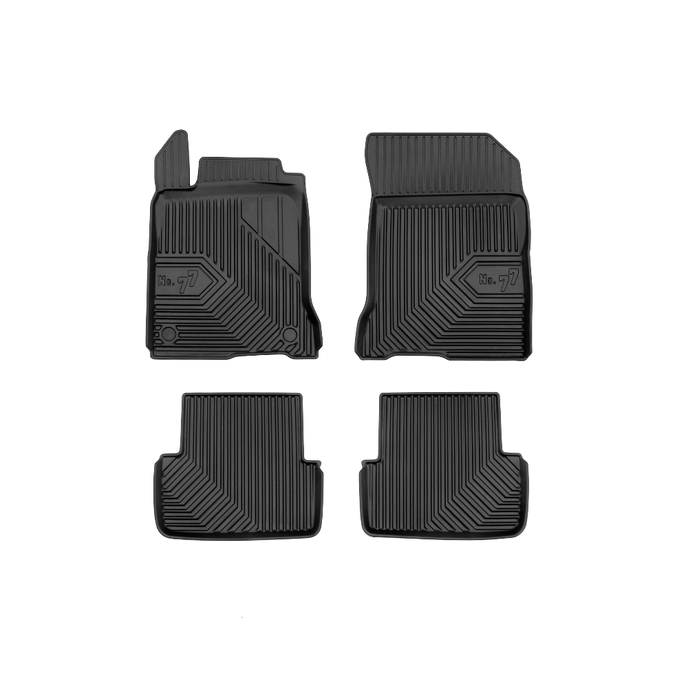 Guminiai Premium 77 kilimėliai: (aukštos kokybės plastiko, gumos mišinys / TPE, komplektas - 4vnt., juodi, krašto aukštis 4 cm, montavimo būdas - spaustukai).AUTOMOBILIŲ KILIMĖLIAI FROGUM 77 PREMIUM• Dėl naujoviškos 3D skenavimo technologijos atitinka idealiai; • Krašto aukštis - 4 cm suteikia didesnę apsaugą nuo nešvarumų • Modernus ir funkcionalus dizainas, išlaikantis nešvarumus kilimėlio viduje • Neslystantys spacialūs spaustukai, lengva montuoti; • Speciali apsauga, leidžianti nuleisti vairuotojo koją;Aukšto lygio apsauga jūsų automobiliui, kilimėliai idealiai atitinka ir puikiai priglunda prie salono grindų. Modernus ir funkcionalus dizainas, bei aukštas kraštas garantuoja efektyvų vandens ir purvo surinkimą ir neleidžia jam nutekėti. Taip automobilio salonas išlieka švarus. Pagaminti iš aukštos kokybės gumos, kurioje nėra toksiškų komponentų. Bekvapis. Kilimėliai turi spaustukus, todėl jį lengva pritvirtinti prie grindų. Guminiai kilimėliai išlaiko savo elastingumą net esant temperatūros pokyčiams. Specialus paviršius neleidžia kilimėliams slysti vairuojant, todėl labai paveikia saugumą ir kelionės komfortą.