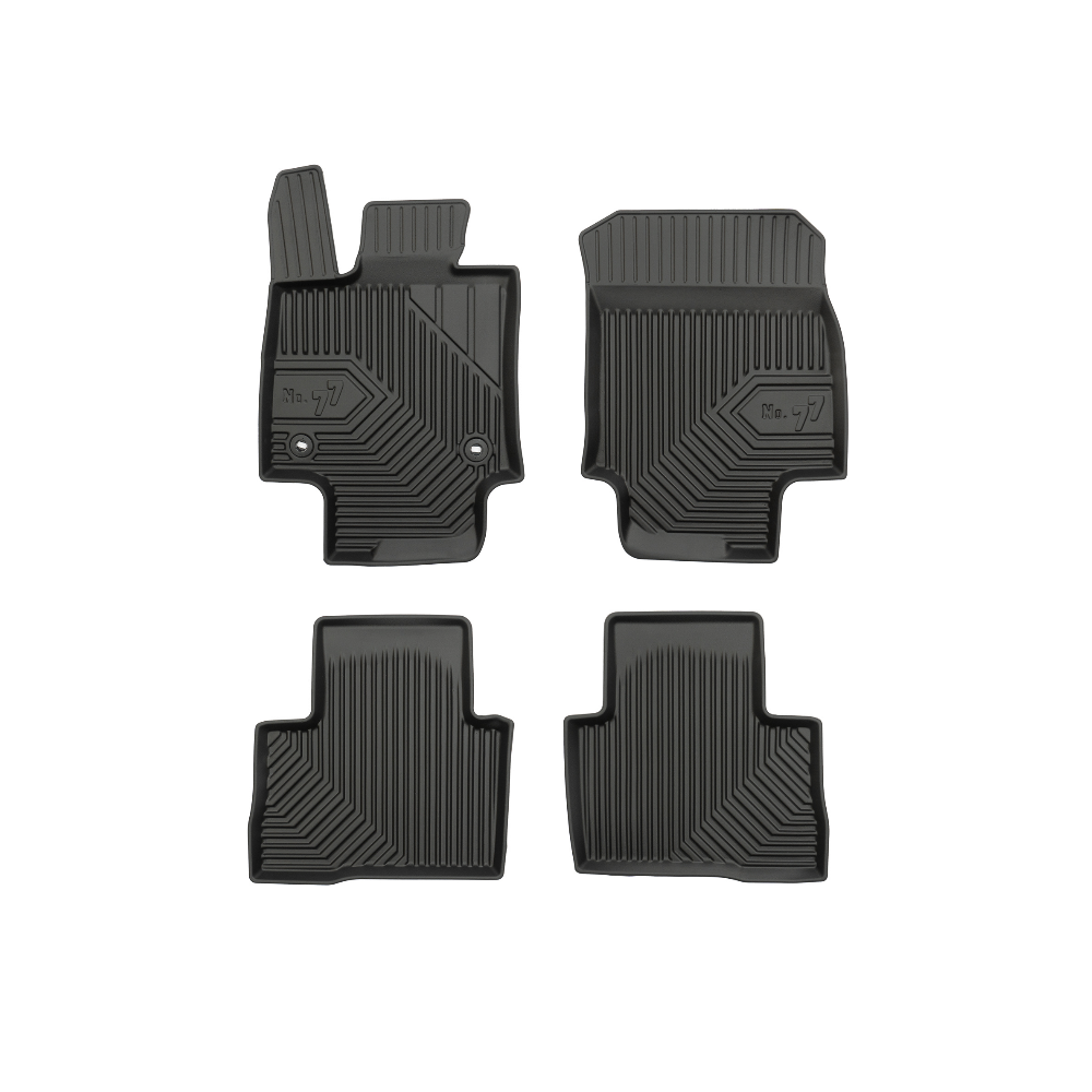 Guminiai Premium 77 kilimėliai: (aukštos kokybės plastiko, gumos mišinys / TPE, komplektas - 4vnt., juodi, krašto aukštis 4 cm, montavimo būdas - spaustukai).AUTOMOBILIŲ KILIMĖLIAI FROGUM 77 PREMIUM• Dėl naujoviškos 3D skenavimo technologijos atitinka idealiai; • Krašto aukštis - 4 cm suteikia didesnę apsaugą nuo nešvarumų • Modernus ir funkcionalus dizainas, išlaikantis nešvarumus kilimėlio viduje • Neslystantys spacialūs spaustukai, lengva montuoti; • Speciali apsauga, leidžianti nuleisti vairuotojo koją;Aukšto lygio apsauga jūsų automobiliui, kilimėliai idealiai atitinka ir puikiai priglunda prie salono grindų. Modernus ir funkcionalus dizainas, bei aukštas kraštas garantuoja efektyvų vandens ir purvo surinkimą ir neleidžia jam nutekėti. Taip automobilio salonas išlieka švarus. Pagaminti iš aukštos kokybės gumos, kurioje nėra toksiškų komponentų. Bekvapis. Kilimėliai turi spaustukus, todėl jį lengva pritvirtinti prie grindų. Guminiai kilimėliai išlaiko savo elastingumą net esant temperatūros pokyčiams. Specialus paviršius neleidžia kilimėliams slysti vairuojant, todėl labai paveikia saugumą ir kelionės komfortą.
