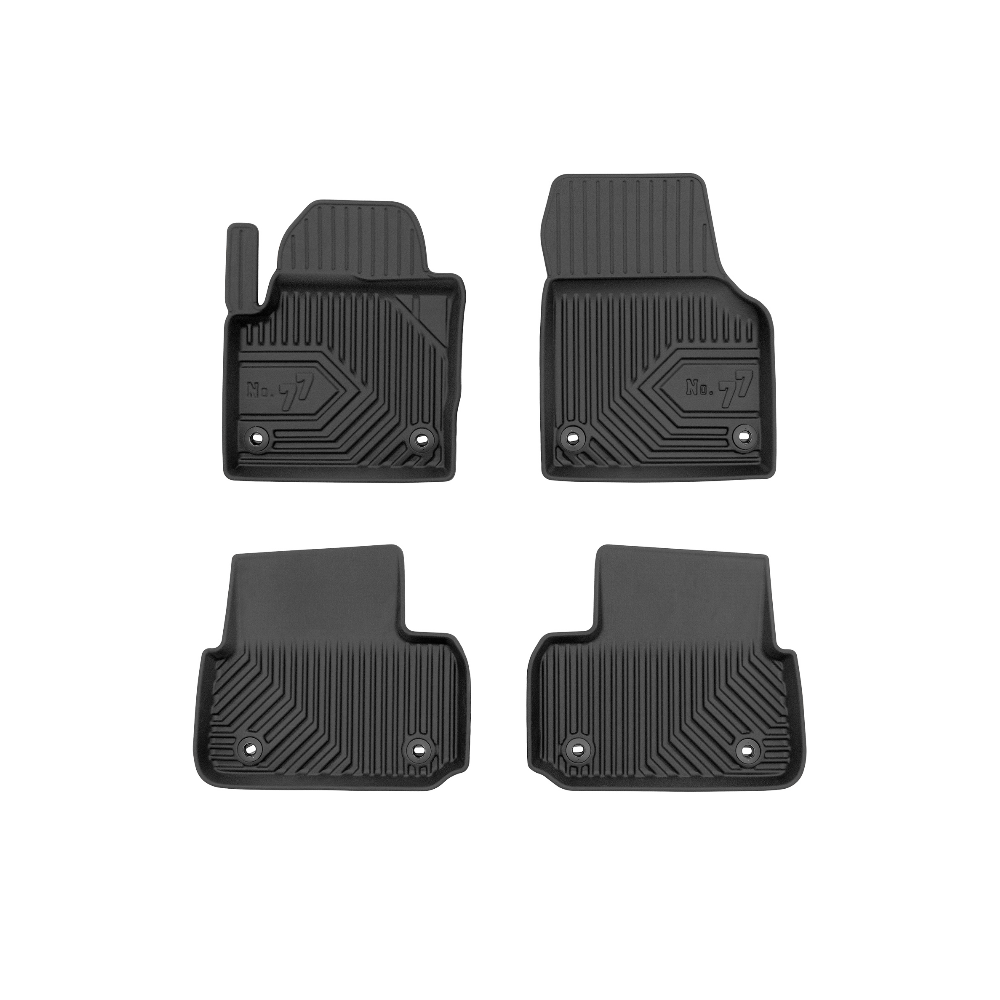 Guminiai Premium 77 kilimėliai: (aukštos kokybės plastiko, gumos mišinys / TPE, komplektas - 4vnt., juodi, krašto aukštis 4 cm, montavimo būdas - spaustukai).AUTOMOBILIŲ KILIMĖLIAI FROGUM 77 PREMIUM• Dėl naujoviškos 3D skenavimo technologijos atitinka idealiai; • Krašto aukštis - 4 cm suteikia didesnę apsaugą nuo nešvarumų • Modernus ir funkcionalus dizainas, išlaikantis nešvarumus kilimėlio viduje • Neslystantys spacialūs spaustukai, lengva montuoti; • Speciali apsauga, leidžianti nuleisti vairuotojo koją;Aukšto lygio apsauga jūsų automobiliui, kilimėliai idealiai atitinka ir puikiai priglunda prie salono grindų. Modernus ir funkcionalus dizainas, bei aukštas kraštas garantuoja efektyvų vandens ir purvo surinkimą ir neleidžia jam nutekėti. Taip automobilio salonas išlieka švarus. Pagaminti iš aukštos kokybės gumos, kurioje nėra toksiškų komponentų. Bekvapis. Kilimėliai turi spaustukus, todėl jį lengva pritvirtinti prie grindų. Guminiai kilimėliai išlaiko savo elastingumą net esant temperatūros pokyčiams. Specialus paviršius neleidžia kilimėliams slysti vairuojant, todėl labai paveikia saugumą ir kelionės komfortą.