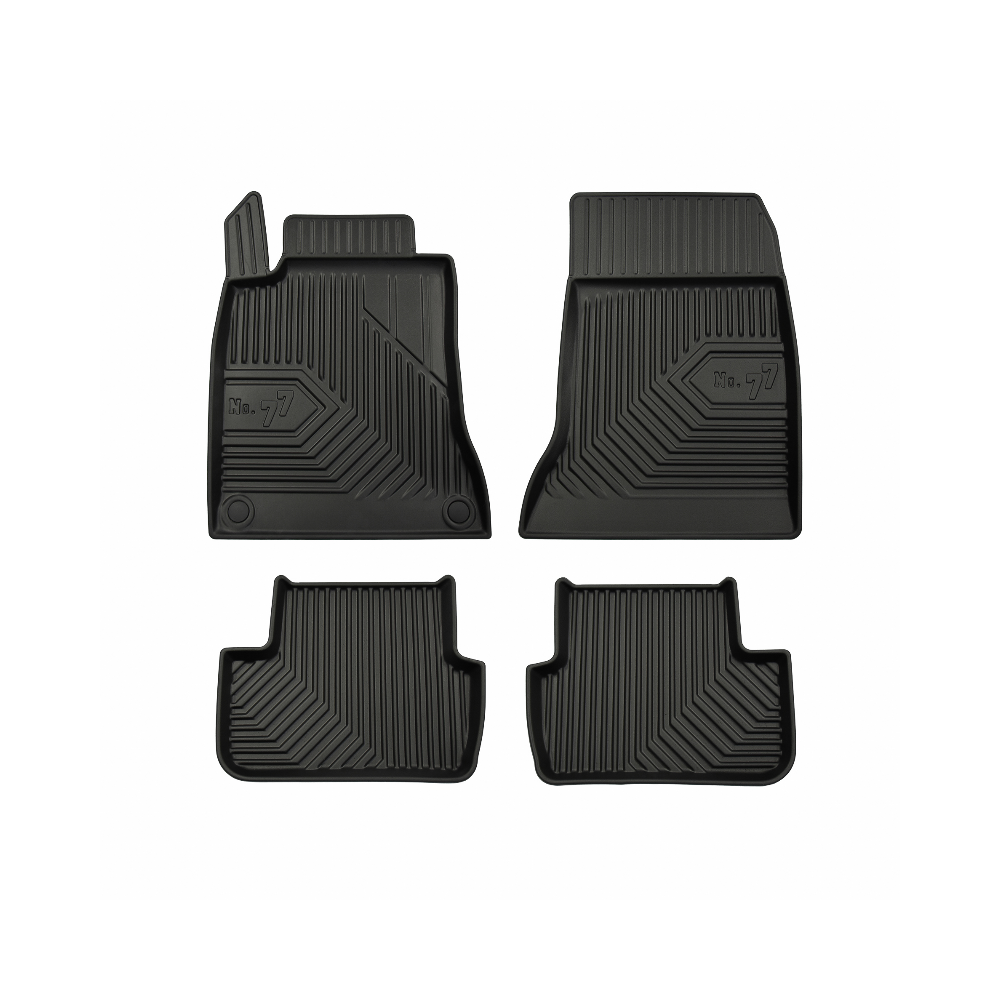 Guminiai Premium 77 kilimėliai: (aukštos kokybės plastiko, gumos mišinys / TPE, komplektas - 4vnt., juodi, krašto aukštis 4 cm, montavimo būdas - spaustukai).