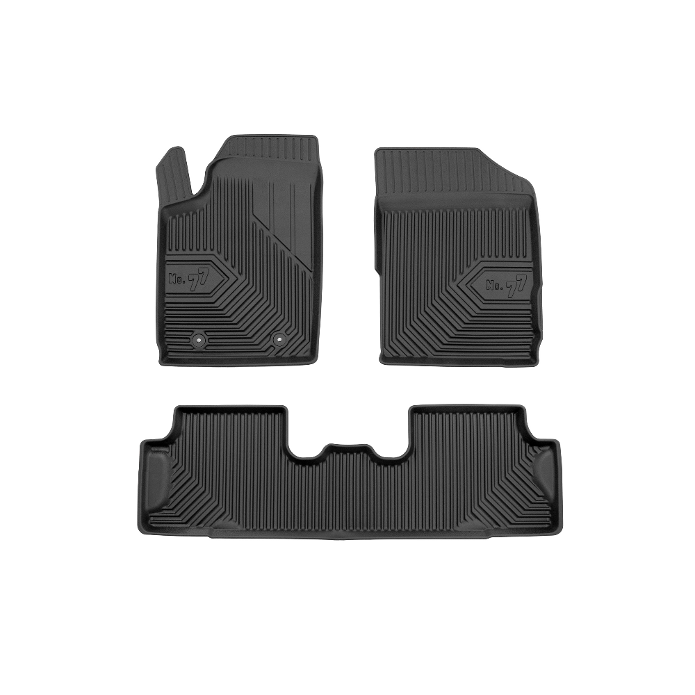 Guminiai Premium 77 kilimėliai: (aukštos kokybės plastiko, gumos mišinys / TPE, komplektas - 3vnt., juodi, krašto aukštis 4 cm, montavimo būdas - spaustukai).AUTOMOBILIŲ KILIMĖLIAI FROGUM 77 PREMIUM• Dėl naujoviškos 3D skenavimo technologijos atitinka idealiai; • Krašto aukštis - 4 cm suteikia didesnę apsaugą nuo nešvarumų • Modernus ir funkcionalus dizainas, išlaikantis nešvarumus kilimėlio viduje • Neslystantys spacialūs spaustukai, lengva montuoti; • Speciali apsauga, leidžianti nuleisti vairuotojo koją;Aukšto lygio apsauga jūsų automobiliui, kilimėliai idealiai atitinka ir puikiai priglunda prie salono grindų. Modernus ir funkcionalus dizainas, bei aukštas kraštas garantuoja efektyvų vandens ir purvo surinkimą ir neleidžia jam nutekėti. Taip automobilio salonas išlieka švarus. Pagaminti iš aukštos kokybės gumos, kurioje nėra toksiškų komponentų. Bekvapis. Kilimėliai turi spaustukus, todėl jį lengva pritvirtinti prie grindų. Guminiai kilimėliai išlaiko savo elastingumą net esant temperatūros pokyčiams. Specialus paviršius neleidžia kilimėliams slysti vairuojant, todėl labai paveikia saugumą ir kelionės komfortą.