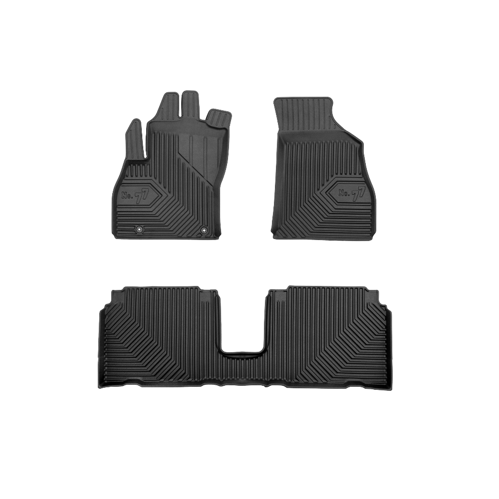 Guminiai Premium 77 kilimėliai: (aukštos kokybės plastiko, gumos mišinys / TPE, komplektas - 3vnt., juodi, krašto aukštis 4 cm, montavimo būdas - spaustukai).AUTOMOBILIŲ KILIMĖLIAI FROGUM 77 PREMIUM• Dėl naujoviškos 3D skenavimo technologijos atitinka idealiai; • Krašto aukštis - 4 cm suteikia didesnę apsaugą nuo nešvarumų • Modernus ir funkcionalus dizainas, išlaikantis nešvarumus kilimėlio viduje • Neslystantys spacialūs spaustukai, lengva montuoti; • Speciali apsauga, leidžianti nuleisti vairuotojo koją;Aukšto lygio apsauga jūsų automobiliui, kilimėliai idealiai atitinka ir puikiai priglunda prie salono grindų. Modernus ir funkcionalus dizainas, bei aukštas kraštas garantuoja efektyvų vandens ir purvo surinkimą ir neleidžia jam nutekėti. Taip automobilio salonas išlieka švarus. Pagaminti iš aukštos kokybės gumos, kurioje nėra toksiškų komponentų. Bekvapis. Kilimėliai turi spaustukus, todėl jį lengva pritvirtinti prie grindų. Guminiai kilimėliai išlaiko savo elastingumą net esant temperatūros pokyčiams. Specialus paviršius neleidžia kilimėliams slysti vairuojant, todėl labai paveikia saugumą ir kelionės komfortą.