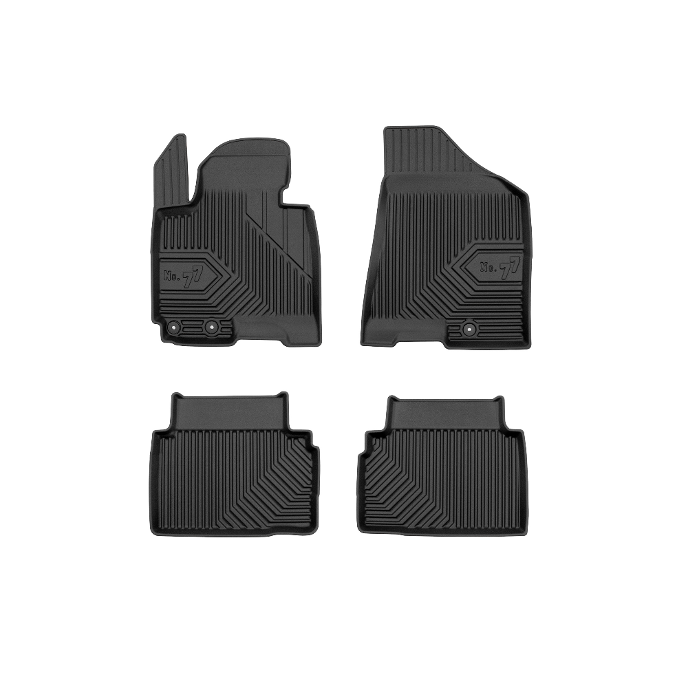 Guminiai Premium 77 kilimėliai: (aukštos kokybės plastiko, gumos mišinys / TPE, komplektas - 4vnt., juodi, krašto aukštis 4 cm, montavimo būdas - spaustukai).AUTOMOBILIŲ KILIMĖLIAI FROGUM 77 PREMIUM• Dėl naujoviškos 3D skenavimo technologijos atitinka idealiai; • Krašto aukštis - 4 cm suteikia didesnę apsaugą nuo nešvarumų • Modernus ir funkcionalus dizainas, išlaikantis nešvarumus kilimėlio viduje • Neslystantys spacialūs spaustukai, lengva montuoti; • Speciali apsauga, leidžianti nuleisti vairuotojo koją;Aukšto lygio apsauga jūsų automobiliui, kilimėliai idealiai atitinka ir puikiai priglunda prie salono grindų. Modernus ir funkcionalus dizainas, bei aukštas kraštas garantuoja efektyvų vandens ir purvo surinkimą ir neleidžia jam nutekėti. Taip automobilio salonas išlieka švarus. Pagaminti iš aukštos kokybės gumos, kurioje nėra toksiškų komponentų. Bekvapis. Kilimėliai turi spaustukus, todėl jį lengva pritvirtinti prie grindų. Guminiai kilimėliai išlaiko savo elastingumą net esant temperatūros pokyčiams. Specialus paviršius neleidžia kilimėliams slysti vairuojant, todėl labai paveikia saugumą ir kelionės komfortą.