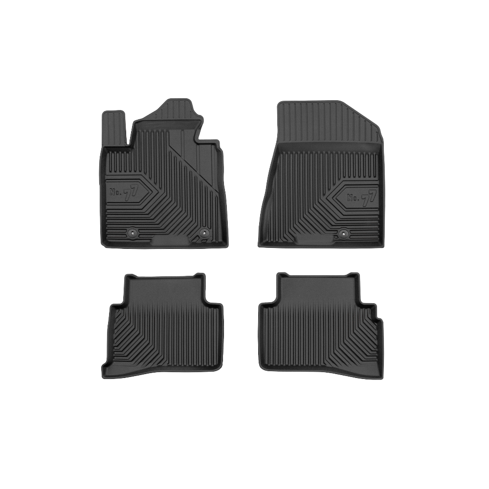 Guminiai Premium 77 kilimėliai: (aukštos kokybės plastiko, gumos mišinys / TPE, komplektas - 4vnt., juodi, krašto aukštis 4 cm, montavimo būdas - spaustukai).AUTOMOBILIŲ KILIMĖLIAI FROGUM 77 PREMIUM• Dėl naujoviškos 3D skenavimo technologijos atitinka idealiai; • Krašto aukštis - 4 cm suteikia didesnę apsaugą nuo nešvarumų • Modernus ir funkcionalus dizainas, išlaikantis nešvarumus kilimėlio viduje • Neslystantys spacialūs spaustukai, lengva montuoti; • Speciali apsauga, leidžianti nuleisti vairuotojo koją;Aukšto lygio apsauga jūsų automobiliui, kilimėliai idealiai atitinka ir puikiai priglunda prie salono grindų. Modernus ir funkcionalus dizainas, bei aukštas kraštas garantuoja efektyvų vandens ir purvo surinkimą ir neleidžia jam nutekėti. Taip automobilio salonas išlieka švarus. Pagaminti iš aukštos kokybės gumos, kurioje nėra toksiškų komponentų. Bekvapis. Kilimėliai turi spaustukus, todėl jį lengva pritvirtinti prie grindų. Guminiai kilimėliai išlaiko savo elastingumą net esant temperatūros pokyčiams. Specialus paviršius neleidžia kilimėliams slysti vairuojant, todėl labai paveikia saugumą ir kelionės komfortą.