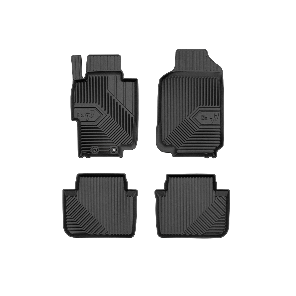 Guminiai Premium 77 kilimėliai: (aukštos kokybės plastiko, gumos mišinys / TPE, komplektas - 4vnt., juodi, krašto aukštis 4 cm, montavimo būdas - spaustukai).AUTOMOBILIŲ KILIMĖLIAI FROGUM 77 PREMIUM• Dėl naujoviškos 3D skenavimo technologijos atitinka idealiai; • Krašto aukštis - 4 cm suteikia didesnę apsaugą nuo nešvarumų • Modernus ir funkcionalus dizainas, išlaikantis nešvarumus kilimėlio viduje • Neslystantys spacialūs spaustukai, lengva montuoti; • Speciali apsauga, leidžianti nuleisti vairuotojo koją;Aukšto lygio apsauga jūsų automobiliui, kilimėliai idealiai atitinka ir puikiai priglunda prie salono grindų. Modernus ir funkcionalus dizainas, bei aukštas kraštas garantuoja efektyvų vandens ir purvo surinkimą ir neleidžia jam nutekėti. Taip automobilio salonas išlieka švarus. Pagaminti iš aukštos kokybės gumos, kurioje nėra toksiškų komponentų. Bekvapis. Kilimėliai turi spaustukus, todėl jį lengva pritvirtinti prie grindų. Guminiai kilimėliai išlaiko savo elastingumą net esant temperatūros pokyčiams. Specialus paviršius neleidžia kilimėliams slysti vairuojant, todėl labai paveikia saugumą ir kelionės komfortą.