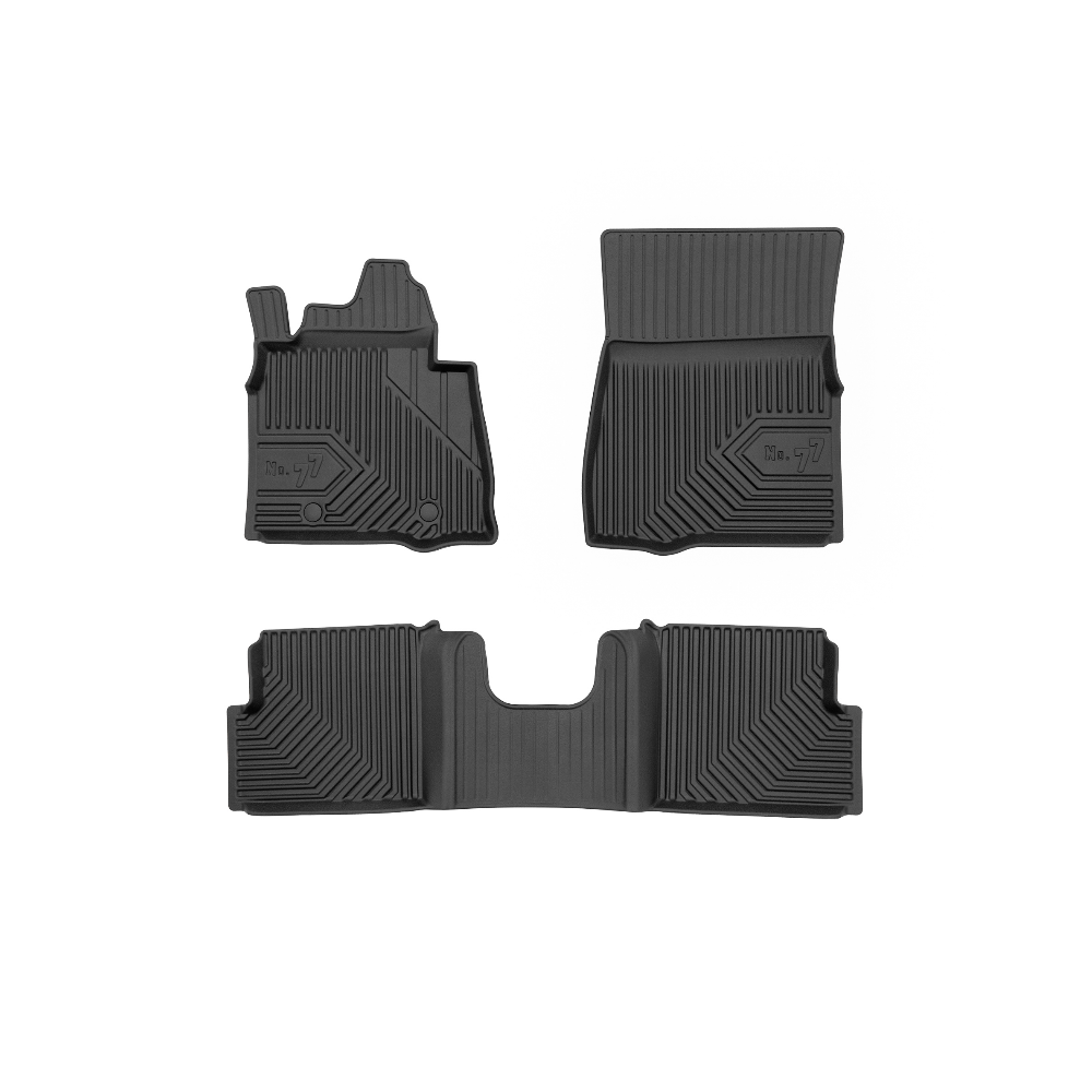 Guminiai Premium 77 kilimėliai: (aukštos kokybės plastiko, gumos mišinys / TPE, komplektas - 3vnt., juodi, krašto aukštis 4 cm, montavimo būdas - spaustukai).AUTOMOBILIŲ KILIMĖLIAI FROGUM 77 PREMIUM• Dėl naujoviškos 3D skenavimo technologijos atitinka idealiai; • Krašto aukštis - 4 cm suteikia didesnę apsaugą nuo nešvarumų • Modernus ir funkcionalus dizainas, išlaikantis nešvarumus kilimėlio viduje • Neslystantys spacialūs spaustukai, lengva montuoti; • Speciali apsauga, leidžianti nuleisti vairuotojo koją;Aukšto lygio apsauga jūsų automobiliui, kilimėliai idealiai atitinka ir puikiai priglunda prie salono grindų. Modernus ir funkcionalus dizainas, bei aukštas kraštas garantuoja efektyvų vandens ir purvo surinkimą ir neleidžia jam nutekėti. Taip automobilio salonas išlieka švarus. Pagaminti iš aukštos kokybės gumos, kurioje nėra toksiškų komponentų. Bekvapis. Kilimėliai turi spaustukus, todėl jį lengva pritvirtinti prie grindų. Guminiai kilimėliai išlaiko savo elastingumą net esant temperatūros pokyčiams. Specialus paviršius neleidžia kilimėliams slysti vairuojant, todėl labai paveikia saugumą ir kelionės komfortą.