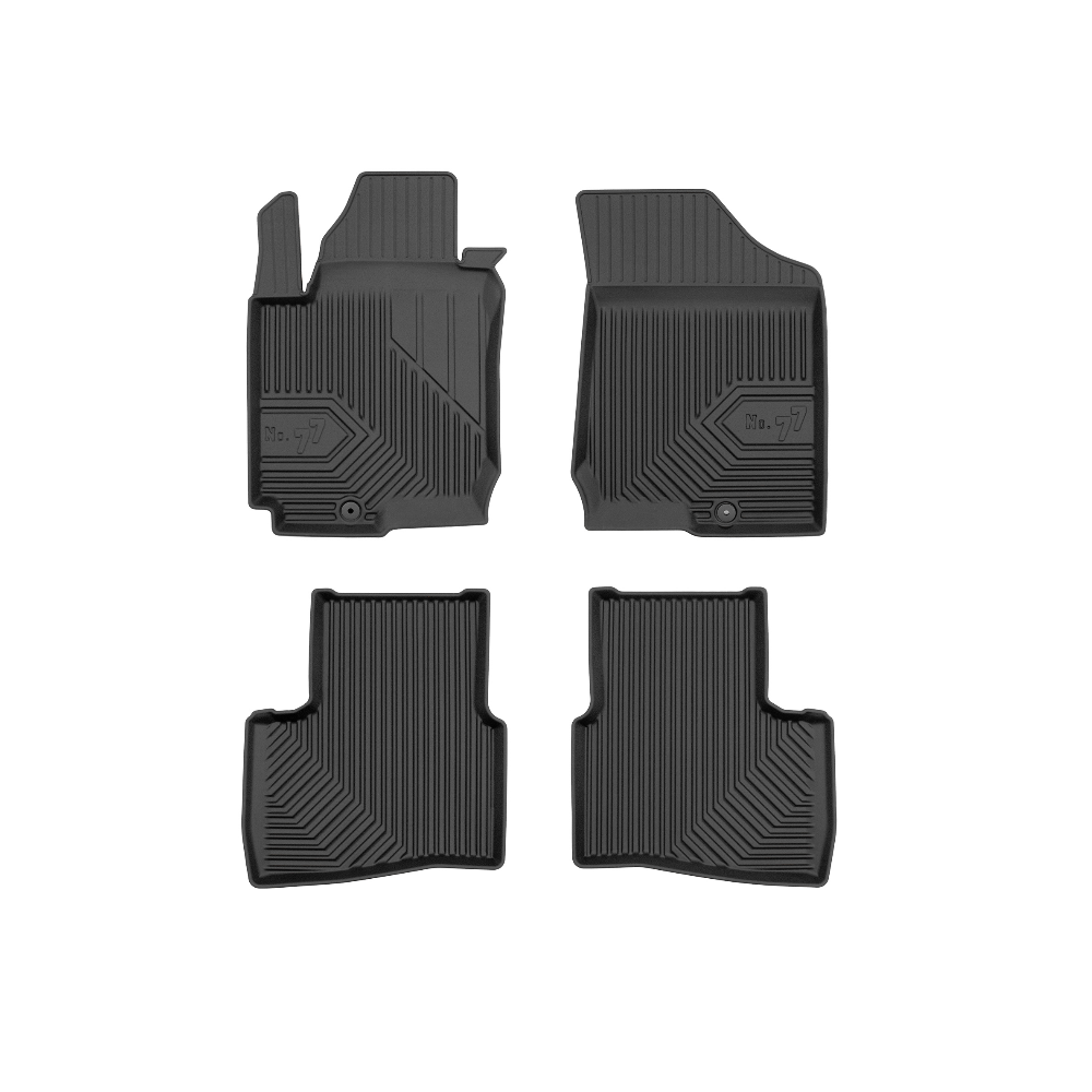 Guminiai Premium 77 kilimėliai: (aukštos kokybės plastiko, gumos mišinys / TPE, komplektas - 4vnt., juodi, krašto aukštis 4 cm, montavimo būdas - spaustukai).AUTOMOBILIŲ KILIMĖLIAI FROGUM 77 PREMIUM• Dėl naujoviškos 3D skenavimo technologijos atitinka idealiai; • Krašto aukštis - 4 cm suteikia didesnę apsaugą nuo nešvarumų • Modernus ir funkcionalus dizainas, išlaikantis nešvarumus kilimėlio viduje • Neslystantys spacialūs spaustukai, lengva montuoti; • Speciali apsauga, leidžianti nuleisti vairuotojo koją;Aukšto lygio apsauga jūsų automobiliui, kilimėliai idealiai atitinka ir puikiai priglunda prie salono grindų. Modernus ir funkcionalus dizainas, bei aukštas kraštas garantuoja efektyvų vandens ir purvo surinkimą ir neleidžia jam nutekėti. Taip automobilio salonas išlieka švarus. Pagaminti iš aukštos kokybės gumos, kurioje nėra toksiškų komponentų. Bekvapis. Kilimėliai turi spaustukus, todėl jį lengva pritvirtinti prie grindų. Guminiai kilimėliai išlaiko savo elastingumą net esant temperatūros pokyčiams. Specialus paviršius neleidžia kilimėliams slysti vairuojant, todėl labai paveikia saugumą ir kelionės komfortą.