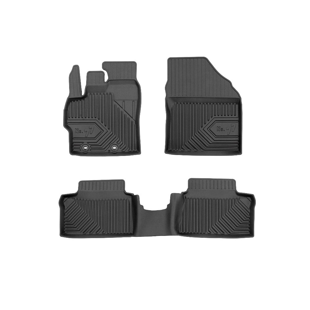 Guminiai Premium 77 kilimėliai: (aukštos kokybės plastiko, gumos mišinys / TPE, komplektas - 3vnt., juodi, krašto aukštis 4 cm, montavimo būdas - spaustukai).AUTOMOBILIŲ KILIMĖLIAI FROGUM 77 PREMIUM• Dėl naujoviškos 3D skenavimo technologijos atitinka idealiai; • Krašto aukštis - 4 cm suteikia didesnę apsaugą nuo nešvarumų • Modernus ir funkcionalus dizainas, išlaikantis nešvarumus kilimėlio viduje • Neslystantys spacialūs spaustukai, lengva montuoti; • Speciali apsauga, leidžianti nuleisti vairuotojo koją;Aukšto lygio apsauga jūsų automobiliui, kilimėliai idealiai atitinka ir puikiai priglunda prie salono grindų. Modernus ir funkcionalus dizainas, bei aukštas kraštas garantuoja efektyvų vandens ir purvo surinkimą ir neleidžia jam nutekėti. Taip automobilio salonas išlieka švarus. Pagaminti iš aukštos kokybės gumos, kurioje nėra toksiškų komponentų. Bekvapis. Kilimėliai turi spaustukus, todėl jį lengva pritvirtinti prie grindų. Guminiai kilimėliai išlaiko savo elastingumą net esant temperatūros pokyčiams. Specialus paviršius neleidžia kilimėliams slysti vairuojant, todėl labai paveikia saugumą ir kelionės komfortą.