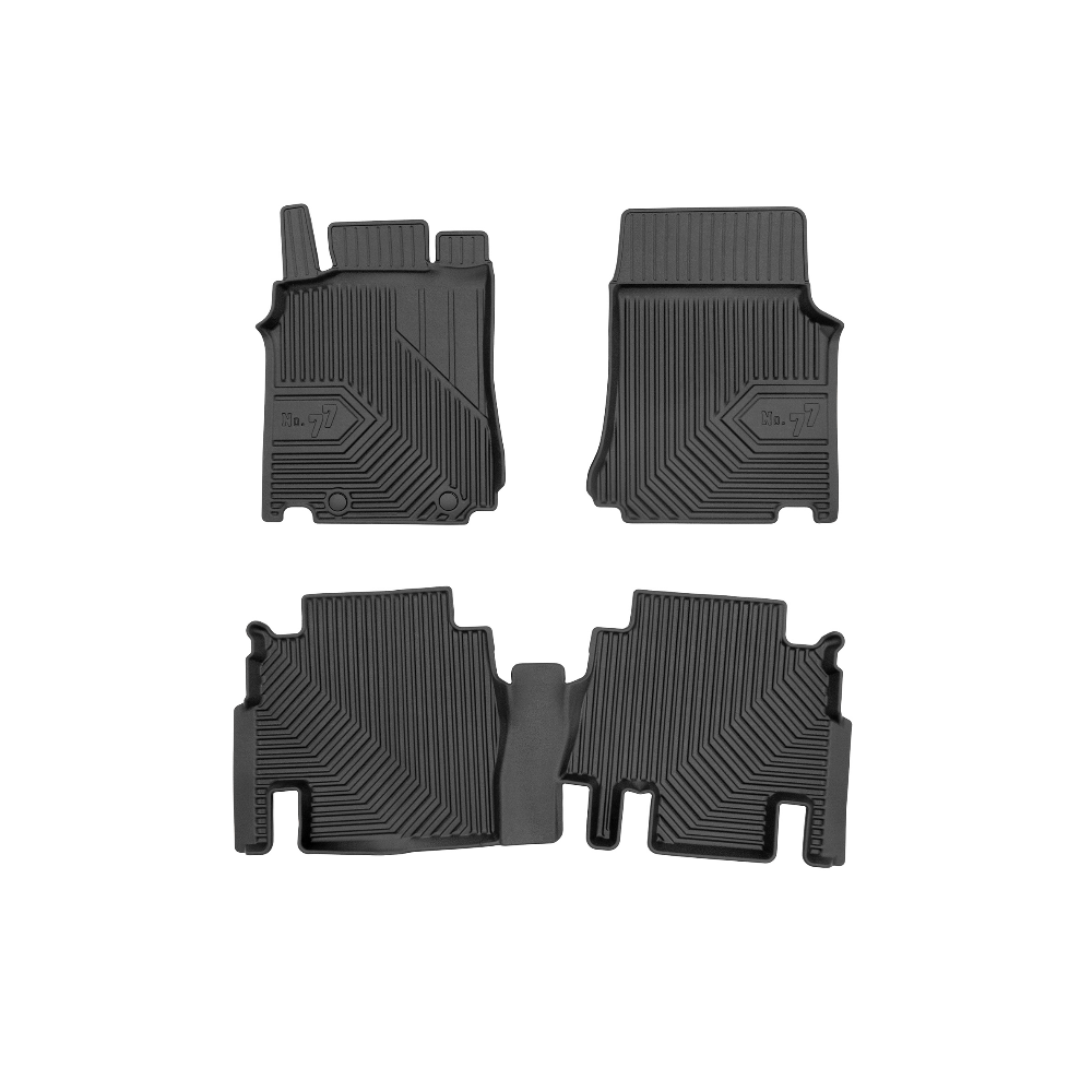 Guminiai Premium 77 kilimėliai: (aukštos kokybės plastiko, gumos mišinys / TPE, komplektas - 3vnt., juodi, krašto aukštis 4 cm, montavimo būdas - spaustukai).AUTOMOBILIŲ KILIMĖLIAI FROGUM 77 PREMIUM• Dėl naujoviškos 3D skenavimo technologijos atitinka idealiai; • Krašto aukštis - 4 cm suteikia didesnę apsaugą nuo nešvarumų • Modernus ir funkcionalus dizainas, išlaikantis nešvarumus kilimėlio viduje • Neslystantys spacialūs spaustukai, lengva montuoti; • Speciali apsauga, leidžianti nuleisti vairuotojo koją;Aukšto lygio apsauga jūsų automobiliui, kilimėliai idealiai atitinka ir puikiai priglunda prie salono grindų. Modernus ir funkcionalus dizainas, bei aukštas kraštas garantuoja efektyvų vandens ir purvo surinkimą ir neleidžia jam nutekėti. Taip automobilio salonas išlieka švarus. Pagaminti iš aukštos kokybės gumos, kurioje nėra toksiškų komponentų. Bekvapis. Kilimėliai turi spaustukus, todėl jį lengva pritvirtinti prie grindų. Guminiai kilimėliai išlaiko savo elastingumą net esant temperatūros pokyčiams. Specialus paviršius neleidžia kilimėliams slysti vairuojant, todėl labai paveikia saugumą ir kelionės komfortą.