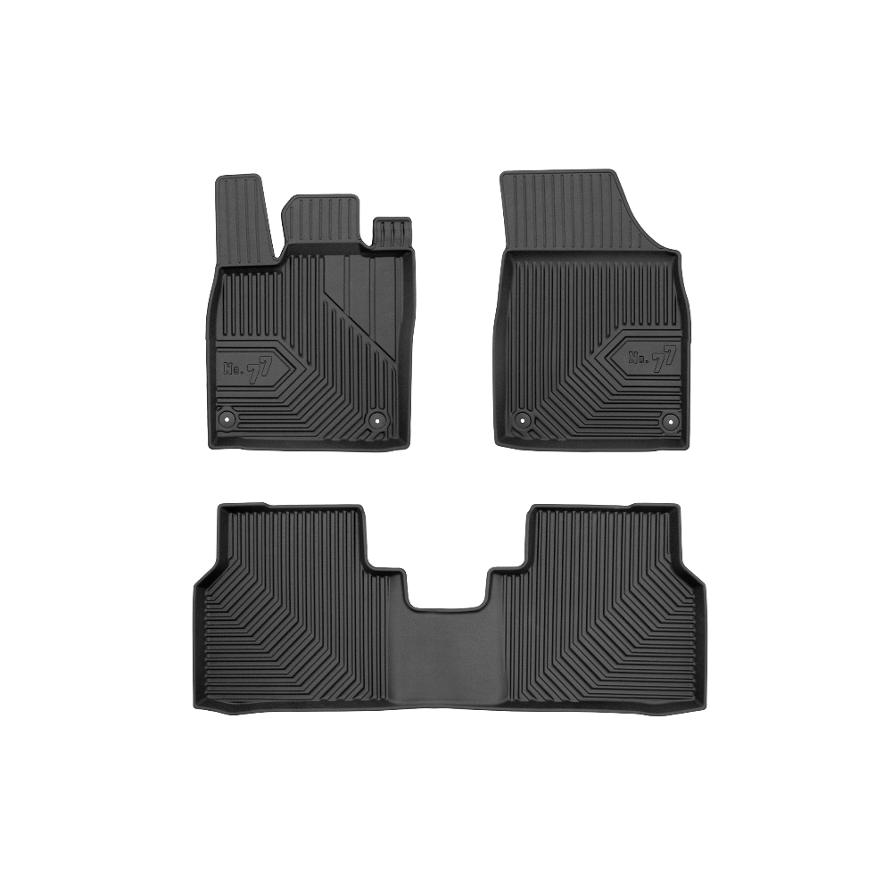 Guminiai Premium 77 kilimėliai: (aukštos kokybės plastiko, gumos mišinys / TPE, komplektas - 3vnt., juodi, krašto aukštis 4 cm, montavimo būdas - spaustukai).AUTOMOBILIŲ KILIMĖLIAI FROGUM 77 PREMIUM• Dėl naujoviškos 3D skenavimo technologijos atitinka idealiai; • Krašto aukštis - 4 cm suteikia didesnę apsaugą nuo nešvarumų • Modernus ir funkcionalus dizainas, išlaikantis nešvarumus kilimėlio viduje • Neslystantys spacialūs spaustukai, lengva montuoti; • Speciali apsauga, leidžianti nuleisti vairuotojo koją;Aukšto lygio apsauga jūsų automobiliui, kilimėliai idealiai atitinka ir puikiai priglunda prie salono grindų. Modernus ir funkcionalus dizainas, bei aukštas kraštas garantuoja efektyvų vandens ir purvo surinkimą ir neleidžia jam nutekėti. Taip automobilio salonas išlieka švarus. Pagaminti iš aukštos kokybės gumos, kurioje nėra toksiškų komponentų. Bekvapis. Kilimėliai turi spaustukus, todėl jį lengva pritvirtinti prie grindų. Guminiai kilimėliai išlaiko savo elastingumą net esant temperatūros pokyčiams. Specialus paviršius neleidžia kilimėliams slysti vairuojant, todėl labai paveikia saugumą ir kelionės komfortą.