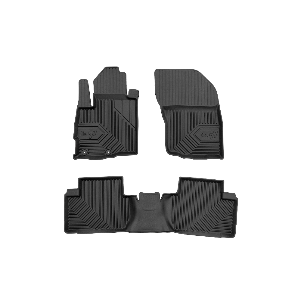 Guminiai Premium 77 kilimėliai: (aukštos kokybės plastiko, gumos mišinys / TPE, komplektas - 3vnt., juodi, krašto aukštis 4 cm, montavimo būdas - spaustukai).AUTOMOBILIŲ KILIMĖLIAI FROGUM 77 PREMIUM• Dėl naujoviškos 3D skenavimo technologijos atitinka idealiai; • Krašto aukštis - 4 cm suteikia didesnę apsaugą nuo nešvarumų • Modernus ir funkcionalus dizainas, išlaikantis nešvarumus kilimėlio viduje • Neslystantys spacialūs spaustukai, lengva montuoti; • Speciali apsauga, leidžianti nuleisti vairuotojo koją;Aukšto lygio apsauga jūsų automobiliui, kilimėliai idealiai atitinka ir puikiai priglunda prie salono grindų. Modernus ir funkcionalus dizainas, bei aukštas kraštas garantuoja efektyvų vandens ir purvo surinkimą ir neleidžia jam nutekėti. Taip automobilio salonas išlieka švarus. Pagaminti iš aukštos kokybės gumos, kurioje nėra toksiškų komponentų. Bekvapis. Kilimėliai turi spaustukus, todėl jį lengva pritvirtinti prie grindų. Guminiai kilimėliai išlaiko savo elastingumą net esant temperatūros pokyčiams. Specialus paviršius neleidžia kilimėliams slysti vairuojant, todėl labai paveikia saugumą ir kelionės komfortą.