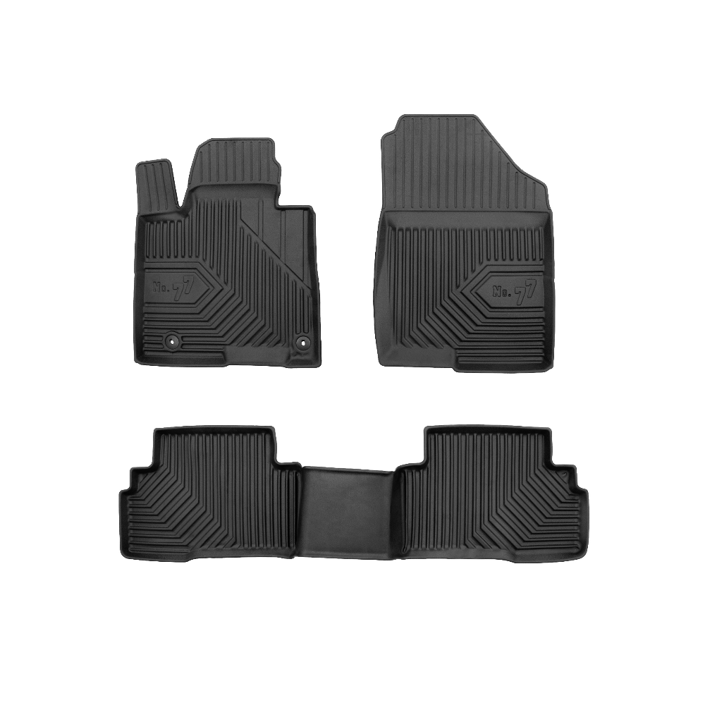 Guminiai Premium 77 kilimėliai: (aukštos kokybės plastiko, gumos mišinys / TPE, komplektas - 3vnt., juodi, krašto aukštis 4 cm, montavimo būdas - spaustukai).AUTOMOBILIŲ KILIMĖLIAI FROGUM 77 PREMIUM• Dėl naujoviškos 3D skenavimo technologijos atitinka idealiai; • Krašto aukštis - 4 cm suteikia didesnę apsaugą nuo nešvarumų • Modernus ir funkcionalus dizainas, išlaikantis nešvarumus kilimėlio viduje • Neslystantys spacialūs spaustukai, lengva montuoti; • Speciali apsauga, leidžianti nuleisti vairuotojo koją;Aukšto lygio apsauga jūsų automobiliui, kilimėliai idealiai atitinka ir puikiai priglunda prie salono grindų. Modernus ir funkcionalus dizainas, bei aukštas kraštas garantuoja efektyvų vandens ir purvo surinkimą ir neleidžia jam nutekėti. Taip automobilio salonas išlieka švarus. Pagaminti iš aukštos kokybės gumos, kurioje nėra toksiškų komponentų. Bekvapis. Kilimėliai turi spaustukus, todėl jį lengva pritvirtinti prie grindų. Guminiai kilimėliai išlaiko savo elastingumą net esant temperatūros pokyčiams. Specialus paviršius neleidžia kilimėliams slysti vairuojant, todėl labai paveikia saugumą ir kelionės komfortą.