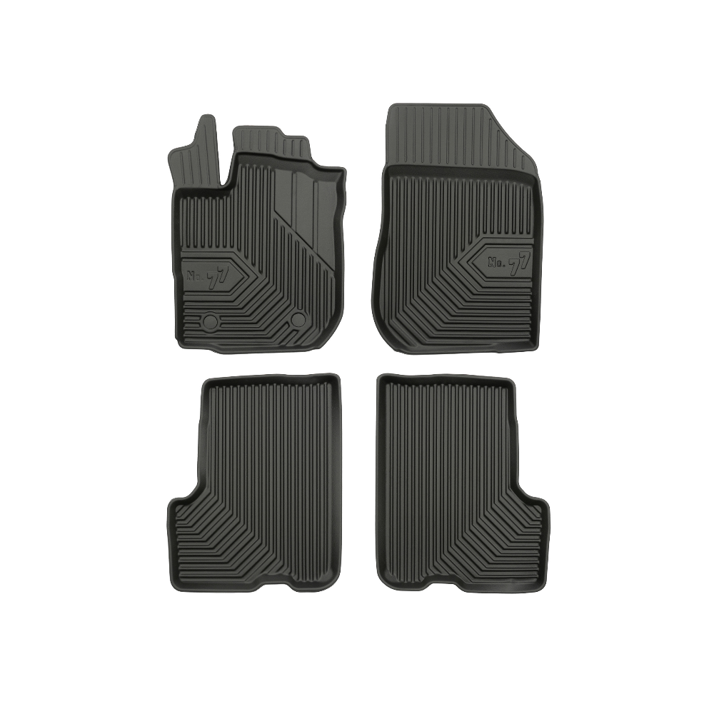 Guminiai Premium 77 kilimėliai: (aukštos kokybės plastiko, gumos mišinys / TPE, komplektas - 4vnt., juodi, krašto aukštis 4 cm, montavimo būdas - spaustukai).AUTOMOBILIŲ KILIMĖLIAI FROGUM 77 PREMIUM• Dėl naujoviškos 3D skenavimo technologijos atitinka idealiai; • Krašto aukštis - 4 cm suteikia didesnę apsaugą nuo nešvarumų • Modernus ir funkcionalus dizainas, išlaikantis nešvarumus kilimėlio viduje • Neslystantys spacialūs spaustukai, lengva montuoti; • Speciali apsauga, leidžianti nuleisti vairuotojo koją;Aukšto lygio apsauga jūsų automobiliui, kilimėliai idealiai atitinka ir puikiai priglunda prie salono grindų. Modernus ir funkcionalus dizainas, bei aukštas kraštas garantuoja efektyvų vandens ir purvo surinkimą ir neleidžia jam nutekėti. Taip automobilio salonas išlieka švarus. Pagaminti iš aukštos kokybės gumos, kurioje nėra toksiškų komponentų. Bekvapis. Kilimėliai turi spaustukus, todėl jį lengva pritvirtinti prie grindų. Guminiai kilimėliai išlaiko savo elastingumą net esant temperatūros pokyčiams. Specialus paviršius neleidžia kilimėliams slysti vairuojant, todėl labai paveikia saugumą ir kelionės komfortą.