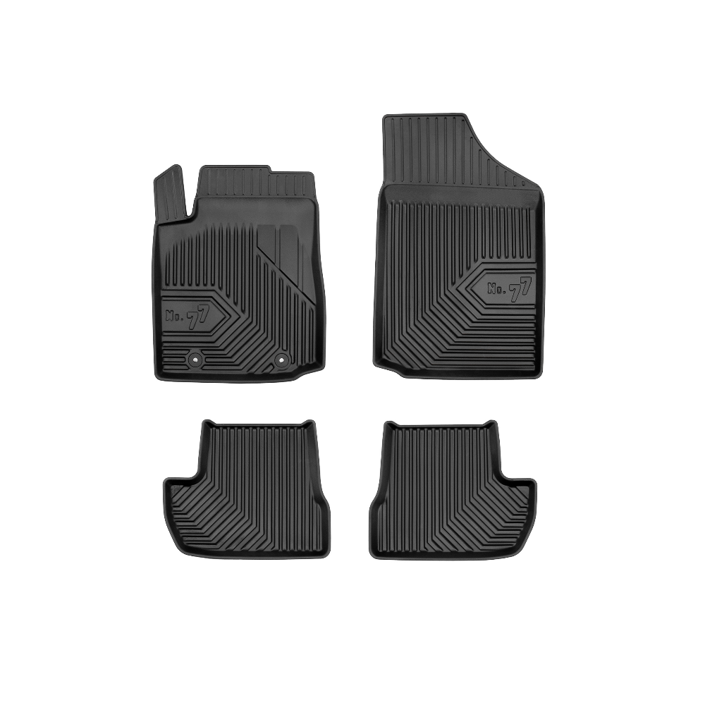 Guminiai Premium 77 kilimėliai: (aukštos kokybės plastiko, gumos mišinys / TPE, komplektas - 4vnt., juodi, krašto aukštis 4 cm, montavimo būdas - spaustukai).AUTOMOBILIŲ KILIMĖLIAI FROGUM 77 PREMIUM• Dėl naujoviškos 3D skenavimo technologijos atitinka idealiai; • Krašto aukštis - 4 cm suteikia didesnę apsaugą nuo nešvarumų • Modernus ir funkcionalus dizainas, išlaikantis nešvarumus kilimėlio viduje • Neslystantys spacialūs spaustukai, lengva montuoti; • Speciali apsauga, leidžianti nuleisti vairuotojo koją;Aukšto lygio apsauga jūsų automobiliui, kilimėliai idealiai atitinka ir puikiai priglunda prie salono grindų. Modernus ir funkcionalus dizainas, bei aukštas kraštas garantuoja efektyvų vandens ir purvo surinkimą ir neleidžia jam nutekėti. Taip automobilio salonas išlieka švarus. Pagaminti iš aukštos kokybės gumos, kurioje nėra toksiškų komponentų. Bekvapis. Kilimėliai turi spaustukus, todėl jį lengva pritvirtinti prie grindų. Guminiai kilimėliai išlaiko savo elastingumą net esant temperatūros pokyčiams. Specialus paviršius neleidžia kilimėliams slysti vairuojant, todėl labai paveikia saugumą ir kelionės komfortą.