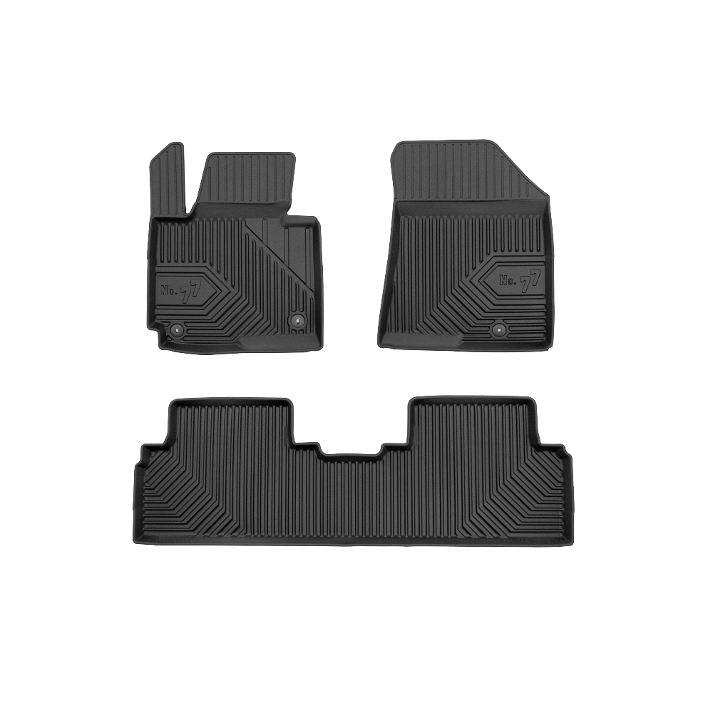 Guminiai Premium 77 kilimėliai: (aukštos kokybės plastiko, gumos mišinys / TPE, komplektas - 3vnt., juodi, krašto aukštis 4 cm, montavimo būdas - spaustukai).AUTOMOBILIŲ KILIMĖLIAI FROGUM 77 PREMIUM• Dėl naujoviškos 3D skenavimo technologijos atitinka idealiai; • Krašto aukštis - 4 cm suteikia didesnę apsaugą nuo nešvarumų • Modernus ir funkcionalus dizainas, išlaikantis nešvarumus kilimėlio viduje • Neslystantys spacialūs spaustukai, lengva montuoti; • Speciali apsauga, leidžianti nuleisti vairuotojo koją;Aukšto lygio apsauga jūsų automobiliui, kilimėliai idealiai atitinka ir puikiai priglunda prie salono grindų. Modernus ir funkcionalus dizainas, bei aukštas kraštas garantuoja efektyvų vandens ir purvo surinkimą ir neleidžia jam nutekėti. Taip automobilio salonas išlieka švarus. Pagaminti iš aukštos kokybės gumos, kurioje nėra toksiškų komponentų. Bekvapis. Kilimėliai turi spaustukus, todėl jį lengva pritvirtinti prie grindų. Guminiai kilimėliai išlaiko savo elastingumą net esant temperatūros pokyčiams. Specialus paviršius neleidžia kilimėliams slysti vairuojant, todėl labai paveikia saugumą ir kelionės komfortą.