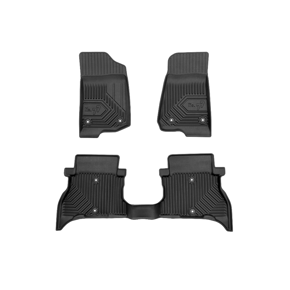 Guminiai Premium 77 kilimėliai: (aukštos kokybės plastiko, gumos mišinys / TPE, komplektas - 3vnt., juodi, krašto aukštis 4 cm, montavimo būdas - spaustukai).AUTOMOBILIŲ KILIMĖLIAI FROGUM 77 PREMIUM• Dėl naujoviškos 3D skenavimo technologijos atitinka idealiai; • Krašto aukštis - 4 cm suteikia didesnę apsaugą nuo nešvarumų • Modernus ir funkcionalus dizainas, išlaikantis nešvarumus kilimėlio viduje • Neslystantys spacialūs spaustukai, lengva montuoti; • Speciali apsauga, leidžianti nuleisti vairuotojo koją;Aukšto lygio apsauga jūsų automobiliui, kilimėliai idealiai atitinka ir puikiai priglunda prie salono grindų. Modernus ir funkcionalus dizainas, bei aukštas kraštas garantuoja efektyvų vandens ir purvo surinkimą ir neleidžia jam nutekėti. Taip automobilio salonas išlieka švarus. Pagaminti iš aukštos kokybės gumos, kurioje nėra toksiškų komponentų. Bekvapis. Kilimėliai turi spaustukus, todėl jį lengva pritvirtinti prie grindų. Guminiai kilimėliai išlaiko savo elastingumą net esant temperatūros pokyčiams. Specialus paviršius neleidžia kilimėliams slysti vairuojant, todėl labai paveikia saugumą ir kelionės komfortą.