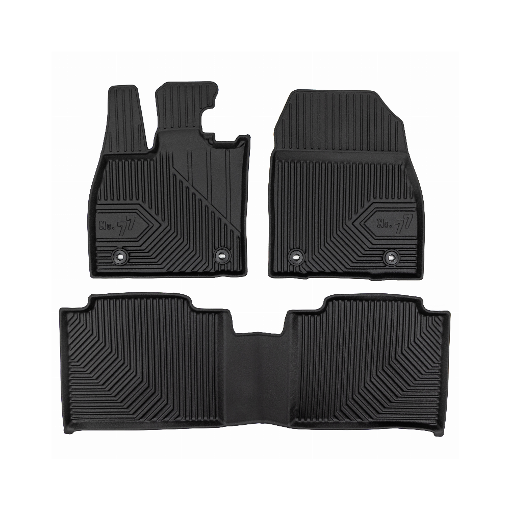 Guminiai Premium 77 kilimėliai: (aukštos kokybės plastiko, gumos mišinys / TPE, komplektas - 3vnt., juodi, krašto aukštis 4 cm, montavimo būdas - spaustukai).AUTOMOBILIŲ KILIMĖLIAI FROGUM 77 PREMIUM• Dėl naujoviškos 3D skenavimo technologijos atitinka idealiai; • Krašto aukštis - 4 cm suteikia didesnę apsaugą nuo nešvarumų • Modernus ir funkcionalus dizainas, išlaikantis nešvarumus kilimėlio viduje • Neslystantys spacialūs spaustukai, lengva montuoti; • Speciali apsauga, leidžianti nuleisti vairuotojo koją;Aukšto lygio apsauga jūsų automobiliui, kilimėliai idealiai atitinka ir puikiai priglunda prie salono grindų. Modernus ir funkcionalus dizainas, bei aukštas kraštas garantuoja efektyvų vandens ir purvo surinkimą ir neleidžia jam nutekėti. Taip automobilio salonas išlieka švarus. Pagaminti iš aukštos kokybės gumos, kurioje nėra toksiškų komponentų. Bekvapis. Kilimėliai turi spaustukus, todėl jį lengva pritvirtinti prie grindų. Guminiai kilimėliai išlaiko savo elastingumą net esant temperatūros pokyčiams. Specialus paviršius neleidžia kilimėliams slysti vairuojant, todėl labai paveikia saugumą ir kelionės komfortą.