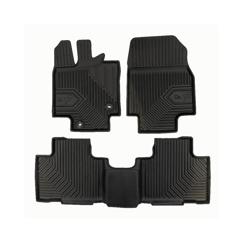 Guminiai Premium 77 kilimėliai: (aukštos kokybės plastiko, gumos mišinys / TPE, komplektas - 3vnt., juodi, krašto aukštis 4 cm, montavimo būdas - spaustukai).AUTOMOBILIŲ KILIMĖLIAI FROGUM 77 PREMIUM• Dėl naujoviškos 3D skenavimo technologijos atitinka idealiai; • Krašto aukštis - 4 cm suteikia didesnę apsaugą nuo nešvarumų • Modernus ir funkcionalus dizainas, išlaikantis nešvarumus kilimėlio viduje • Neslystantys spacialūs spaustukai, lengva montuoti; • Speciali apsauga, leidžianti nuleisti vairuotojo koją;Aukšto lygio apsauga jūsų automobiliui, kilimėliai idealiai atitinka ir puikiai priglunda prie salono grindų. Modernus ir funkcionalus dizainas, bei aukštas kraštas garantuoja efektyvų vandens ir purvo surinkimą ir neleidžia jam nutekėti. Taip automobilio salonas išlieka švarus. Pagaminti iš aukštos kokybės gumos, kurioje nėra toksiškų komponentų. Bekvapis. Kilimėliai turi spaustukus, todėl jį lengva pritvirtinti prie grindų. Guminiai kilimėliai išlaiko savo elastingumą net esant temperatūros pokyčiams. Specialus paviršius neleidžia kilimėliams slysti vairuojant, todėl labai paveikia saugumą ir kelionės komfortą.