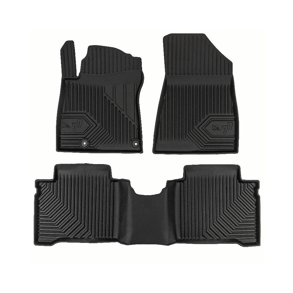 Guminiai Premium 77 kilimėliai: (aukštos kokybės plastiko, gumos mišinys / TPE, komplektas - 3vnt., juodi, krašto aukštis 4 cm, montavimo būdas - spaustukai).AUTOMOBILIŲ KILIMĖLIAI FROGUM 77 PREMIUM• Dėl naujoviškos 3D skenavimo technologijos atitinka idealiai; • Krašto aukštis - 4 cm suteikia didesnę apsaugą nuo nešvarumų • Modernus ir funkcionalus dizainas, išlaikantis nešvarumus kilimėlio viduje • Neslystantys spacialūs spaustukai, lengva montuoti; • Speciali apsauga, leidžianti nuleisti vairuotojo koją;Aukšto lygio apsauga jūsų automobiliui, kilimėliai idealiai atitinka ir puikiai priglunda prie salono grindų. Modernus ir funkcionalus dizainas, bei aukštas kraštas garantuoja efektyvų vandens ir purvo surinkimą ir neleidžia jam nutekėti. Taip automobilio salonas išlieka švarus. Pagaminti iš aukštos kokybės gumos, kurioje nėra toksiškų komponentų. Bekvapis. Kilimėliai turi spaustukus, todėl jį lengva pritvirtinti prie grindų. Guminiai kilimėliai išlaiko savo elastingumą net esant temperatūros pokyčiams. Specialus paviršius neleidžia kilimėliams slysti vairuojant, todėl labai paveikia saugumą ir kelionės komfortą.