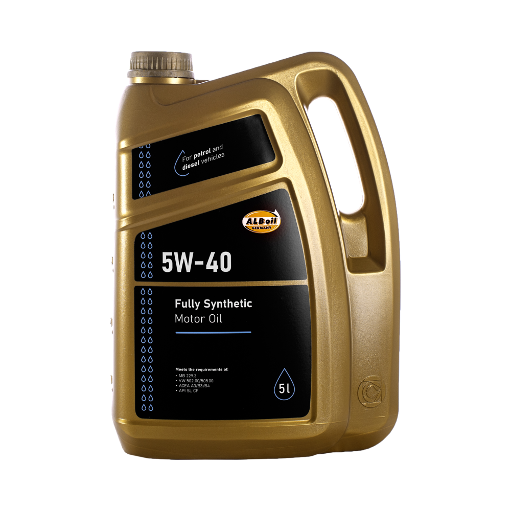 ALB OIL SAE 5W-40, pilnai sintetinė, puikių eksploatavimo savybių ir plačios paskirties alyva. Skirta automobiliams su dyzeliniais ir benzininiais varikliais, įskaitant variklius su įpurškimo sistemomis, keliais vožtuvais vienam cilindrui, ir turbininio pripūtimo varikliams. Atitinka specifikacijas: MB 229.3 VW 502 00/505 00 ACEA A3/B3/B4 API SL CF