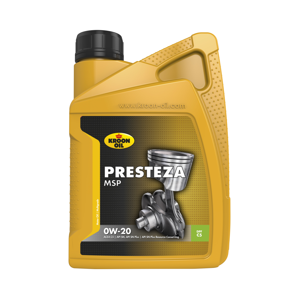 „Presteza MSP 0W-20“ yra moderni, degalus taupanti sintetinė „Mid-SAPS“ variklio alyva. Ši variklinė alyva prisideda prie mažų degalų sąnaudų. Specialios sintetinės alyvos bazės dėka, papildyta naujausios kartos priedais, Kroonoil „Presteza MSP 0W-20“ alyva pasižymi šiomis savybėmis: • Aukštas degalų taupymo lygis ir stabilus klampumo indeksas • Efektyvus atsparumas šlytėjimui • Labai sklandus užvedimas, net esant ypač žemai lauko temperatūrai • Mažesnis degimo metu susidariusių nuosedų kiekis • Užtikrina ilgesnį kietųjų dalelių filtrų ir katalizatorių tarnavimo laiką • Efektyvus variklio darbas esant tiek aukštai, tiek žemai temperatūrai • Pasižymi puikiomis plaunamosiomis savybėmis, didelis atsparumas devėjimuisi ir korozijai Taikymas: „Presteza MSP 0W-20“ yra ypač mažo klampumo degalus taupanti Mid- SAPS variklio alyva, skirta naujausios kartos automobiliams su kietųjų dalelių filtru ir (arba) katalizatoriumi. Produktas taip pat labai tinka hibridinėms transporto priemonėms, kurioms reikalinga mažo klampumo SAE 0W-20 variklinė alyva, turinti vieną iš žemiau išvardytų specifikacijų. Produkto specifikacijos: ACEA C5 API SN, API SN Plus API SN Plus Resource Conserving ILSAC GF-5 BMW Longlife-17 FE+ MB 229.71 Opel/Vauxhall OV0401547 Volvo VCC RBS0-2AE