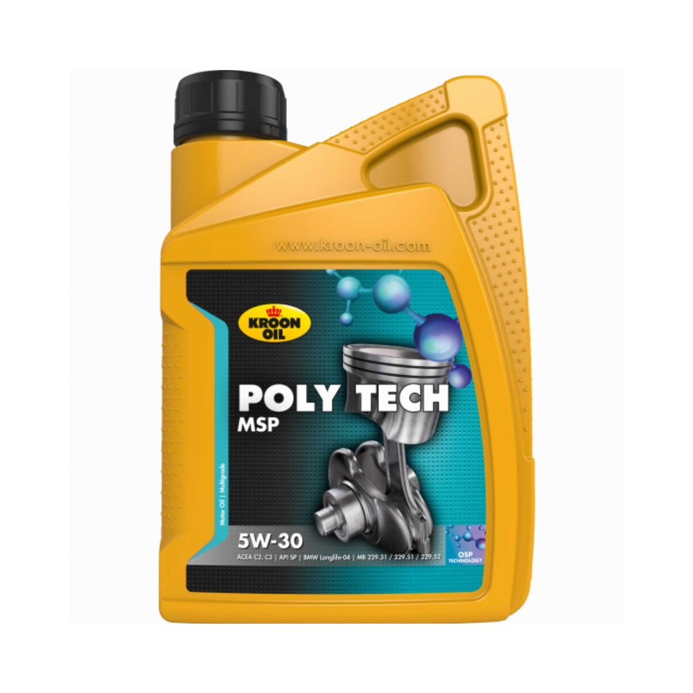 PolyTech MSP 5W-30 yra aukščiausios kokybės variklinė alyva, kuri apsaugo svarbiausias variklio darbines dalis, veikiančias ekstremaliomis sąlygomis. Produktas pagamintas aukštos kokybės bazinės alyvos pagrindu, sujungtos su itin pažangiu priedų paketu, kuriame, be kita ko, yra specialių „OSP“ priedų. „PolyTech MSP 5W-30“ pasižymi šiomis savybėmis: • Labai pagerintomis plovimo savybėmis • Išskirtiniu šlyties stabilumu dėl naudojamų aukšto klampumo indekso (VI) • Labai sklandžiu užvedimu šaltyje, net esant itin žemai temperatūrai, ženkliai sumažinantis nusidėvėjimą užvedant • Sulėtintu variklio senėjimo procesu • Puikia apsauga nuo nusidėvėjimo ir korozijos • Pagerintu oksidacijos stabilumu • Sumažinta judančių variklio dalių trintim • Sumažintu alyvos suvartojimuTaikymas:PolyTech MSP 5W-30 tinka naudoti tiek benzininiuose, tiek dyzeliniuose automobiliuose ir furgonuose. Naudojant specialius „OSP“ priedus, PolyTech MSP 5W-30 idealiai tinka naudoti transporto priemonėse, veikiamose ekstremaliomis sąlygomis, tokiomis kaip: dažnas važiavimas intensyvaus eismo metu, „sportiškas“ vairavimas arba dažnas užvedimas žemoje temperatūrioje.Atitinka specifikacijas:ACEA C2, C3 API SP BMW Longlife-04 Fiat 9.55535-S1 GM dexos 2 MB 229,31 / 229,51 / 229,52 Opel OV 040 1547 - D30 / G30 VW 505,00 / 505,01