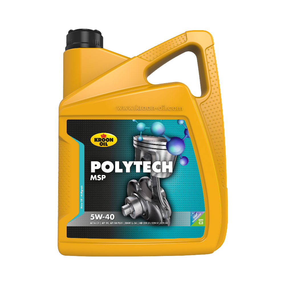 PolyTech MSP 5W-40 yra aukščiausios kokybės variklinė alyva, kuri apsaugo svarbiausias variklio darbines dalis, veikiančias ekstremaliomis sąlygomis. Produktas pagamintas aukštos kokybės bazinės alyvos pagrindu, sujungtos su itin pažangiu priedų paketu, kuriame, be kita ko, yra specialių „OSP“ priedų. „PolyTech MSP 5W-40“ pasižymi šiomis savybėmis: • Labai pagerintomis plovimo savybėmis • Išskirtiniu šlyties stabilumu dėl naudojamų aukšto klampumo indekso (VI) • Labai sklandžiu užvedimu šaltyje, net esant itin žemai temperatūrai, ženkliai sumažinantis nusidėvėjimą užvedant • Sulėtintu variklio senėjimo procesu • Puikia apsauga nuo nusidėvėjimo ir korozijos • Pagerintu oksidacijos stabilumu • Sumažinta judančių variklio dalių trintim • Sumažintu alyvos suvartojimu Taikymas: PolyTech MSP 5W-40 tinka naudoti tiek benzininiuose, tiek dyzeliniuose automobiliuose ir furgonuose. Naudojant specialius „OSP“ priedus, PolyTech MSP 5W-40 idealiai tinka naudoti transporto priemonėse, veikiamose ekstremaliomis sąlygomis, tokiomis kaip: dažnas važiavimas intensyvaus eismo metu, „sportiškas“ vairavimas arba dažnas užvedimas žemoje temperatūrioje.Atitinka specifikacijas: ACEA C3 API SN, API SN Plus BMW Longlife-04 MB 229,31 / 229,51 / 229,52 VW 505,00 / 505,01 Ford M2C917-A